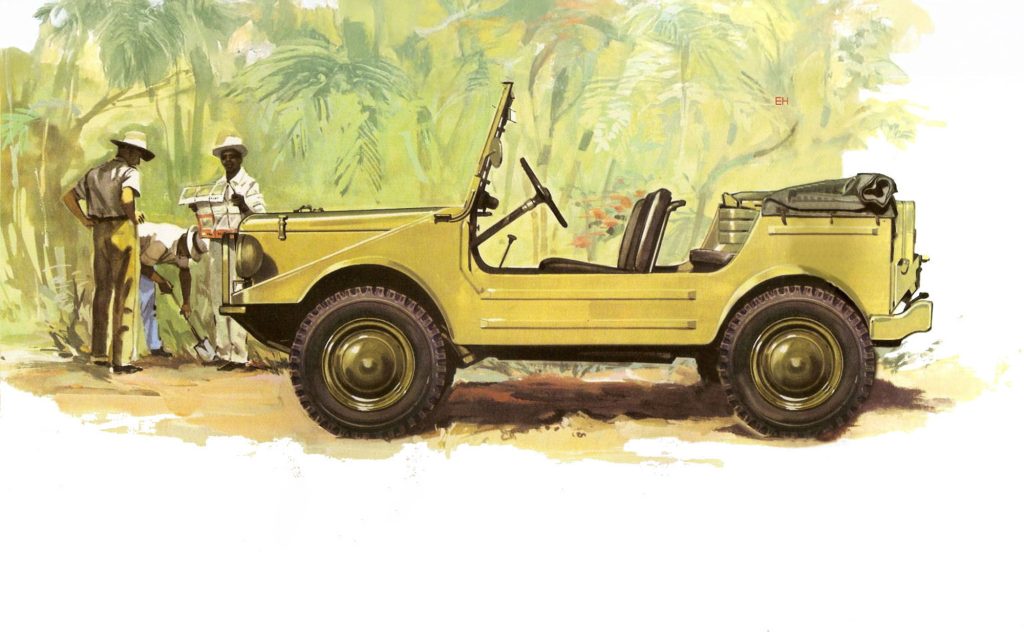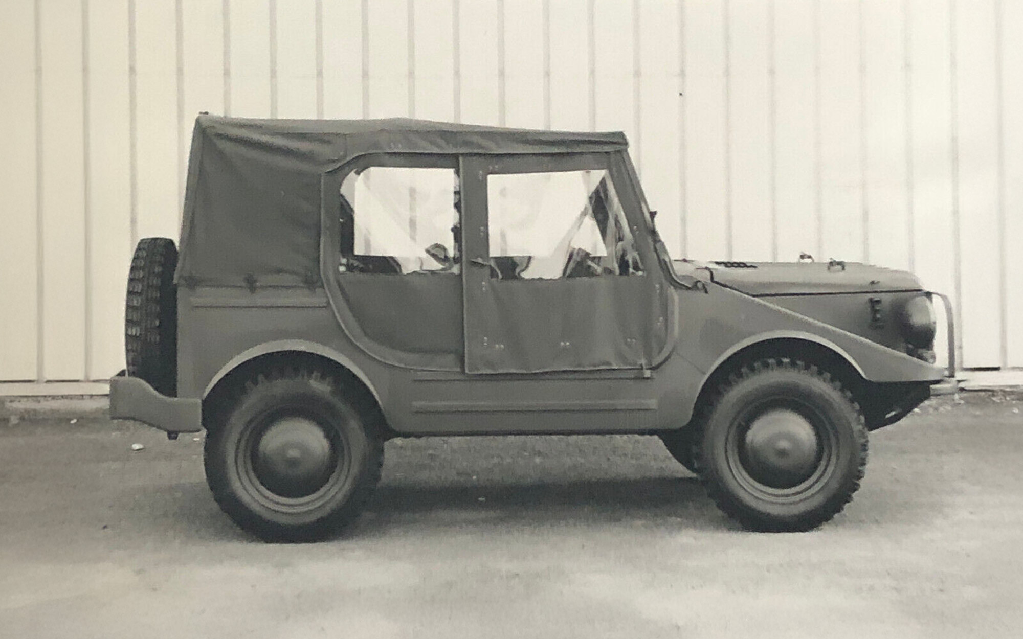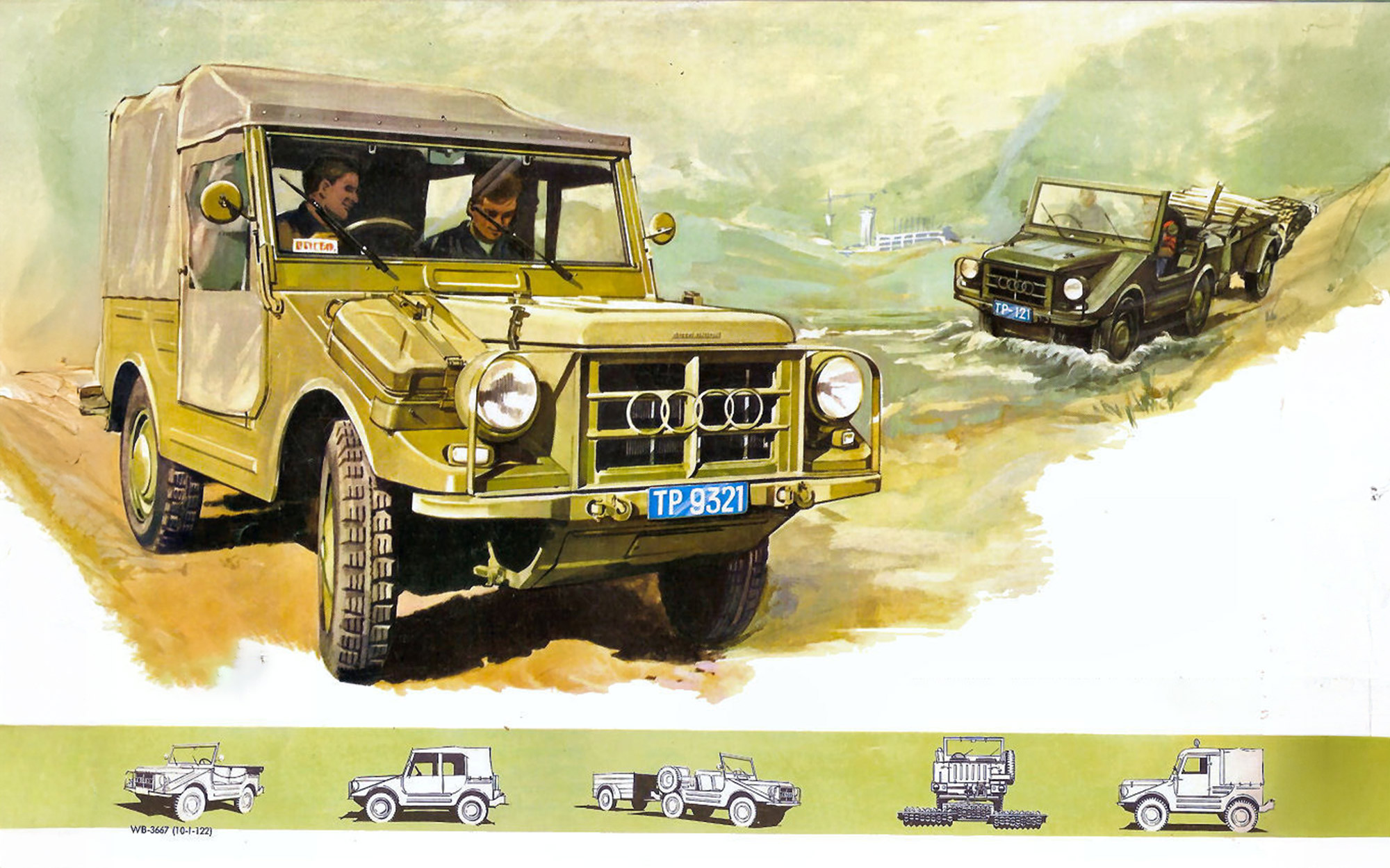 In 1953, German authorities circulated confidential requirements for potential off-road vehicles for the Bundesgrenzschutz (Border Police) and the armed forces that would later become the Bundeswehr (founded on 12 November 1955). Auto Union responded with a design derived from its DKW 3=6 passenger car mechanicals and the DKW Schnellaster van, adapting the company’s two-stroke powertrain and lightweight construction experience to create a rugged military platform.