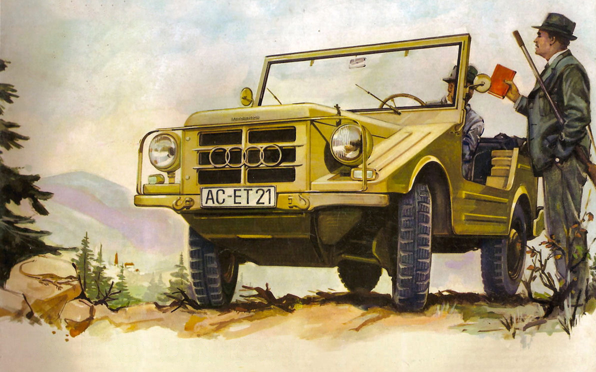 Between 1953 and 1956, Auto Union developed a prototype known as the DKW F 91/4, the designation indicating a four-wheel-drive variant of the DKW F 91. Built at the Ingolstadt plant, the vehicle was submitted to competitive trials and won the government tender over competing “Jagdwagen” (hunter’s car) concepts, including the Goliath Typ 31 and Porsche 597.