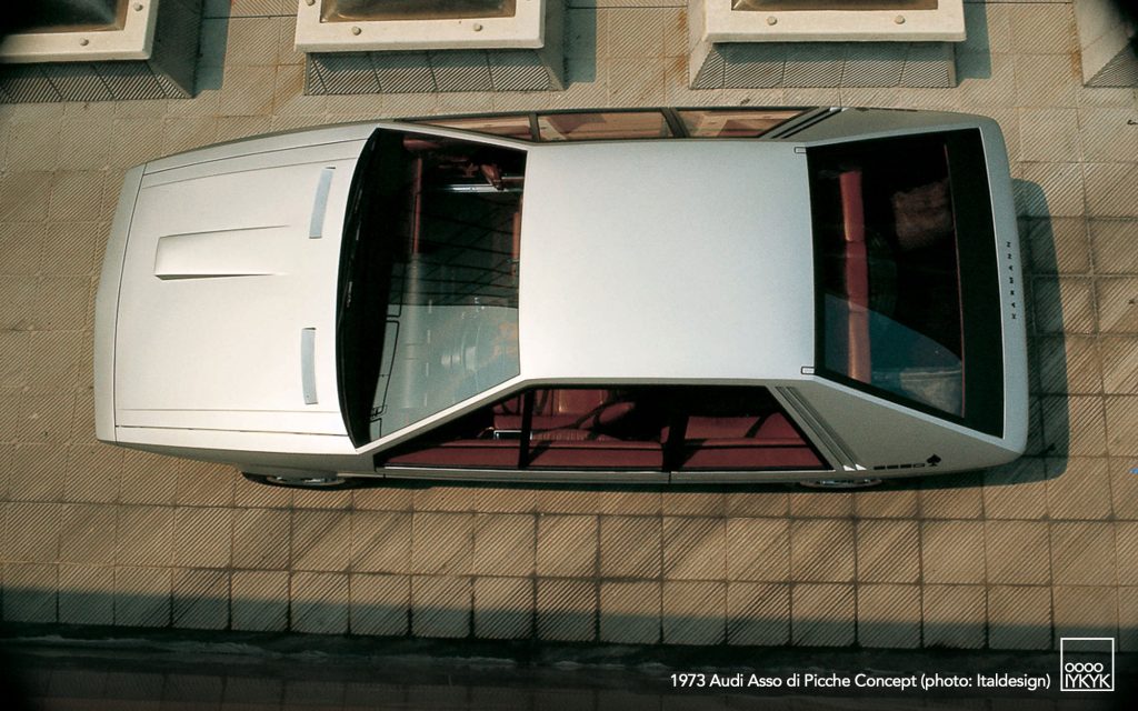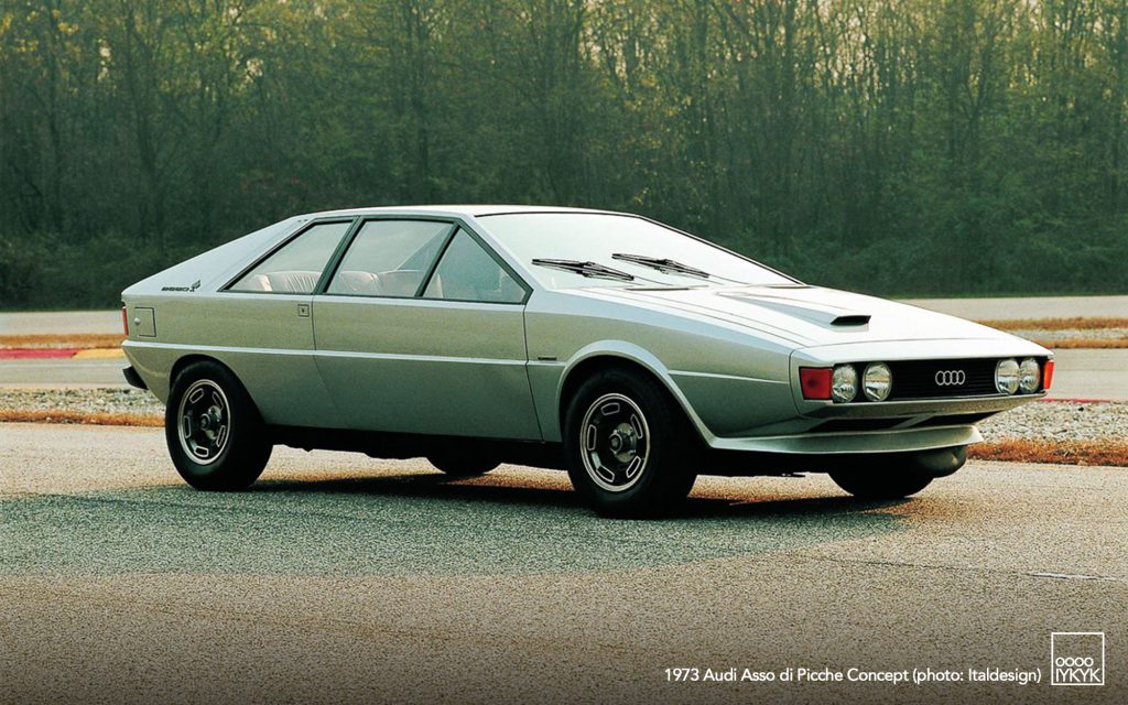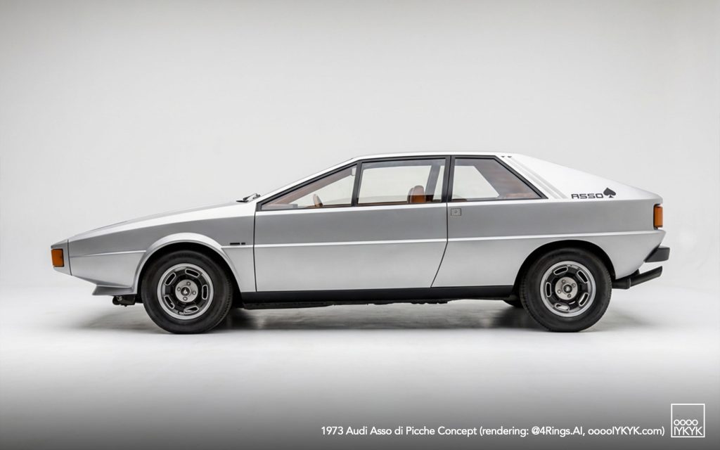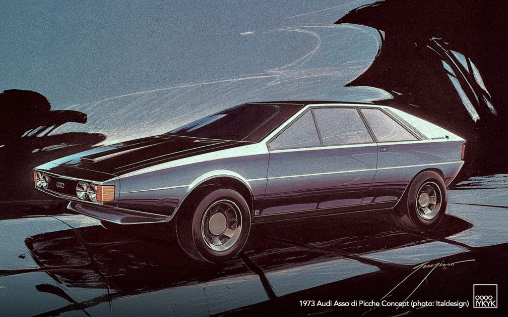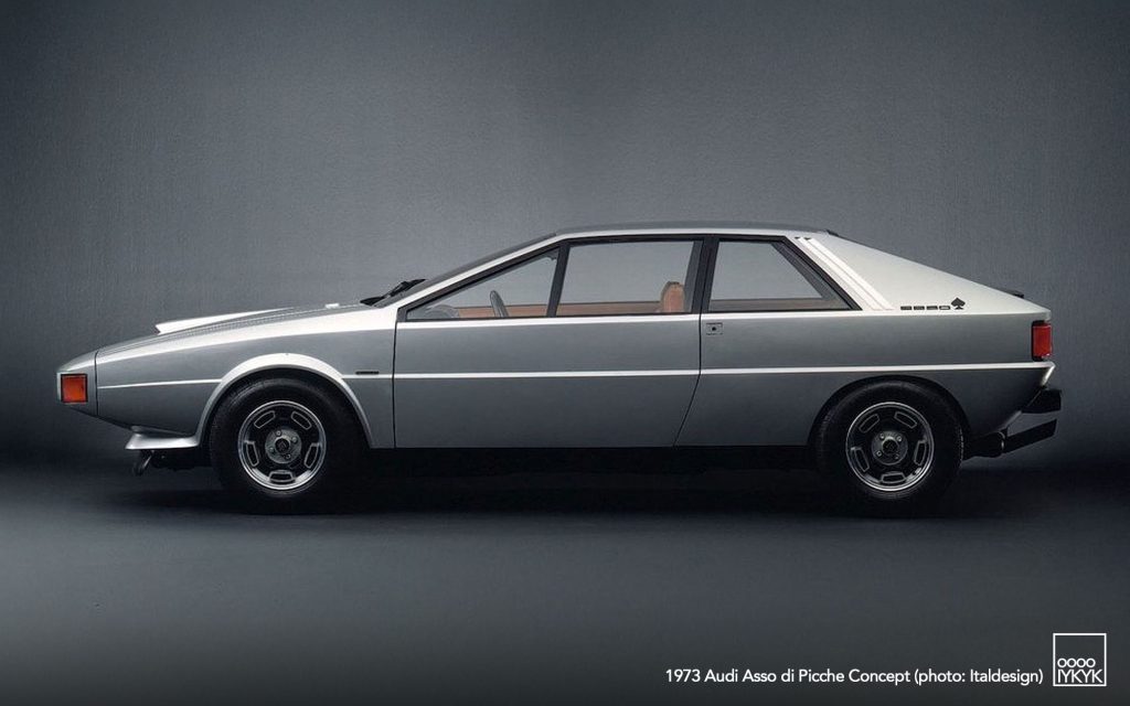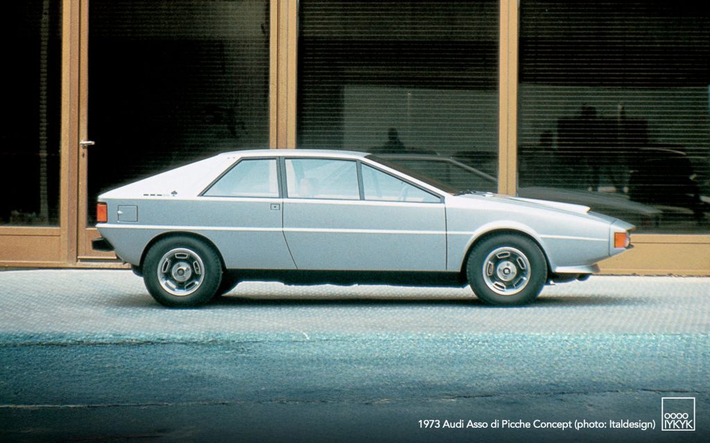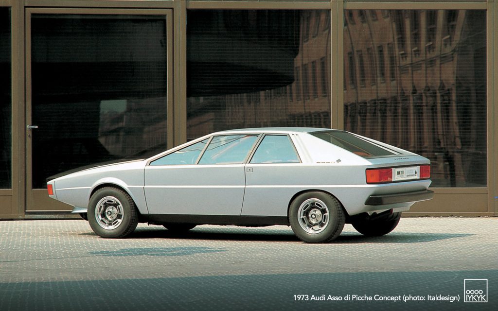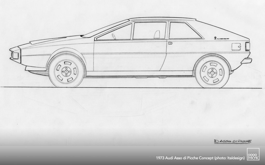The Audi Asso di Picche is a 1973 concept car developed by Italdesign under the direction of Giorgetto Giugiaro, with construction undertaken by Karmann. Conceived as a four-seat sports coupé based on the mechanical layout of the Audi 80 (B1), the project was intended to demonstrate the feasibility of a limited-series production model rather than to serve as a purely experimental show car.
