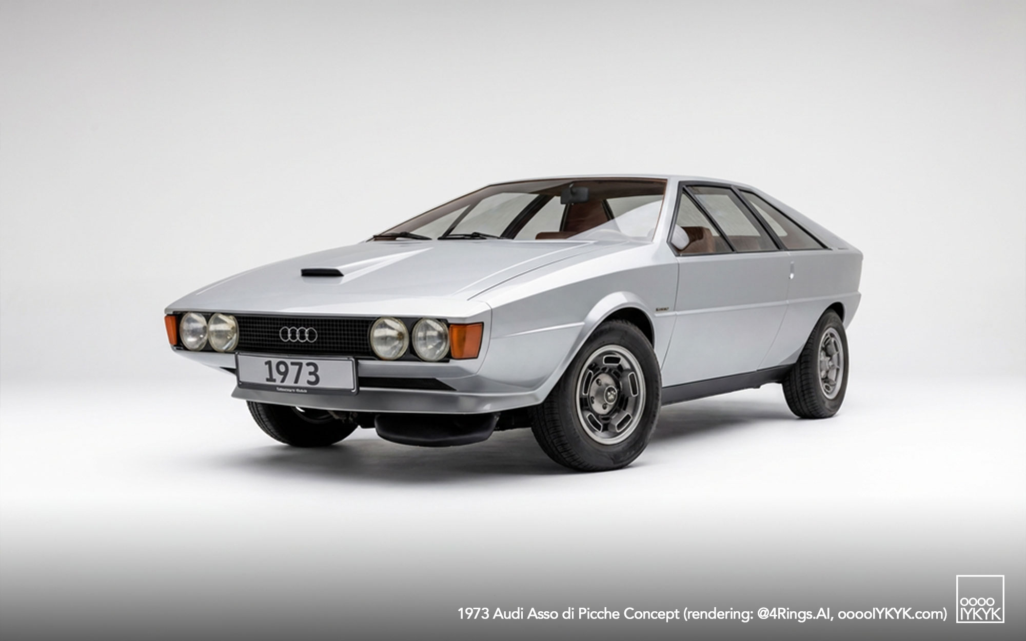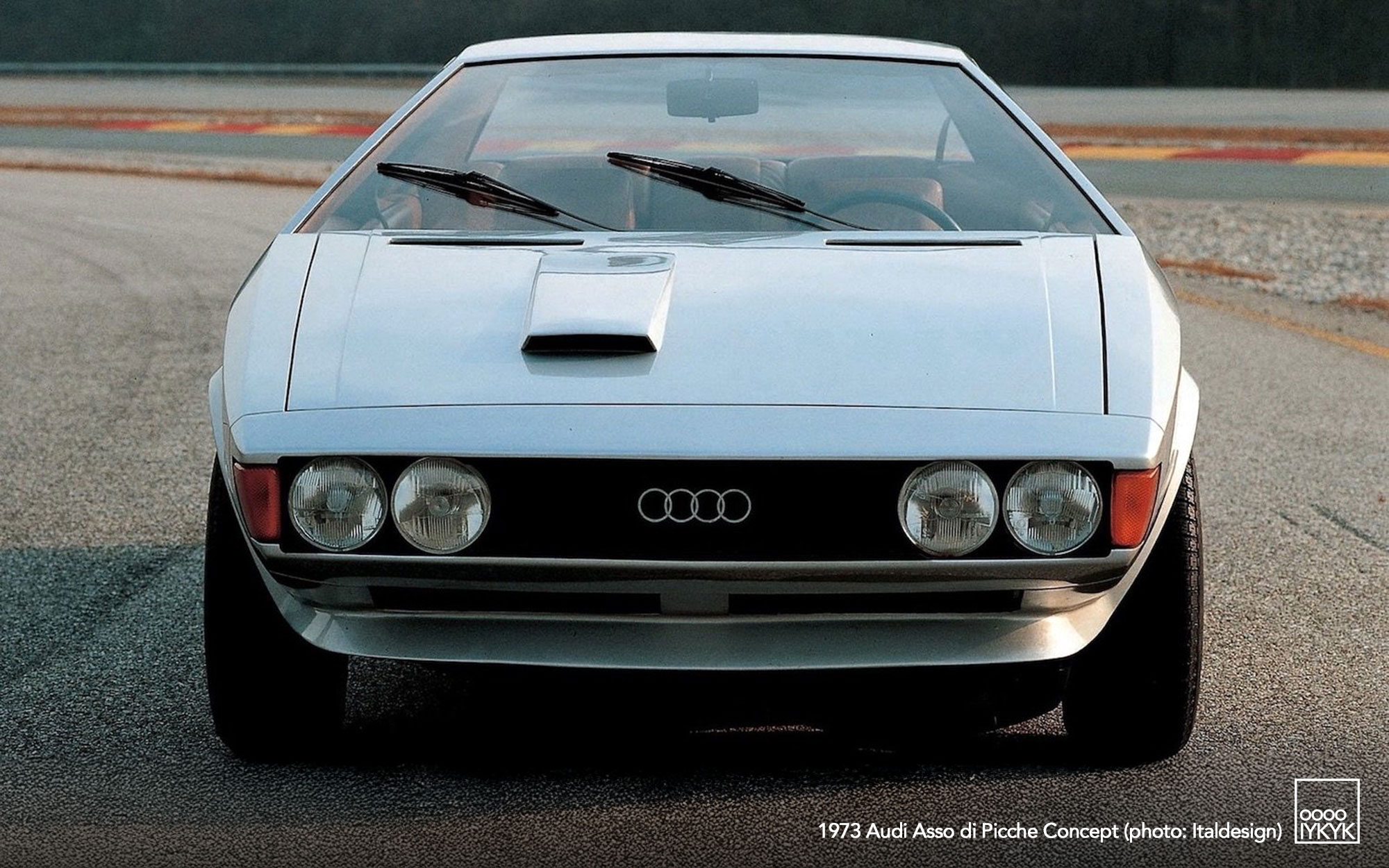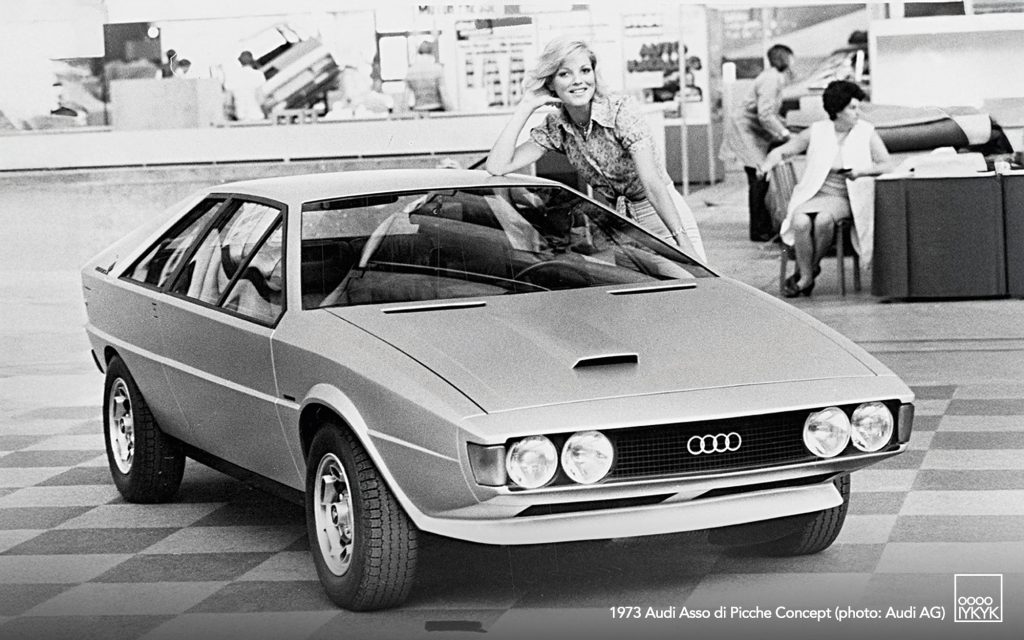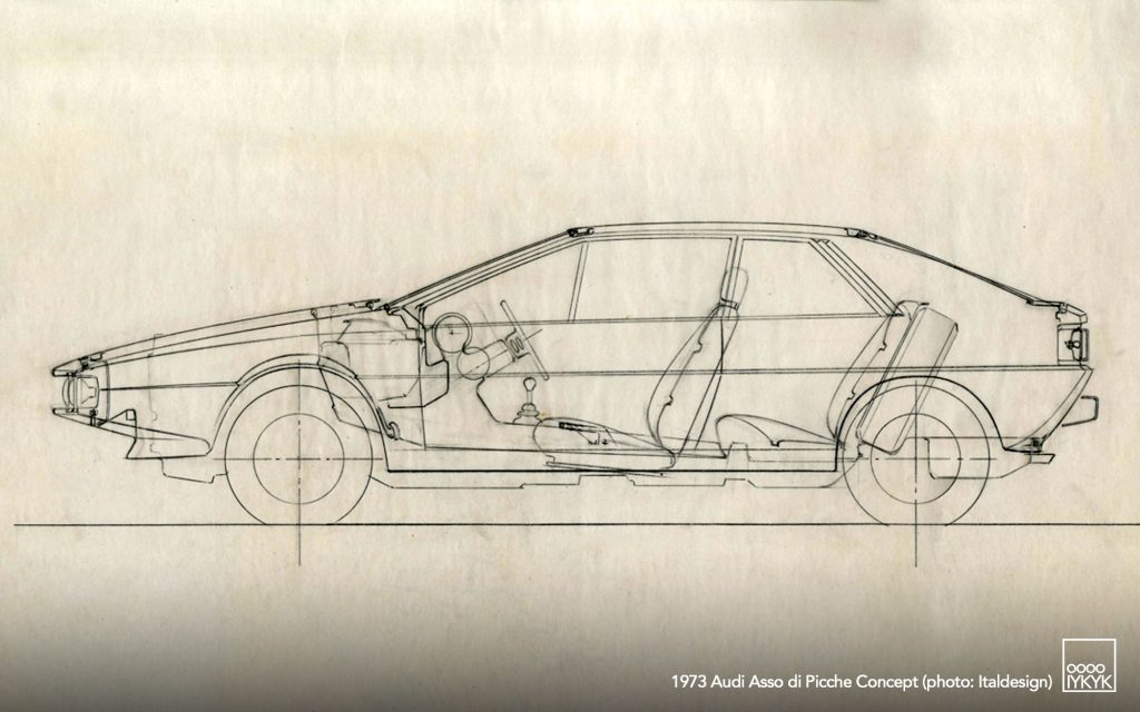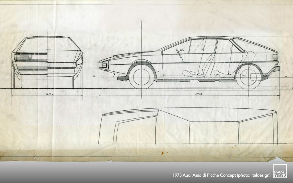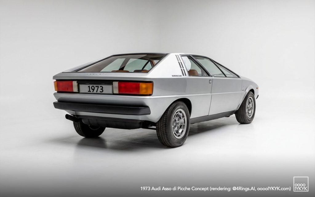 The Audi Asso di Picche is a 1973 concept car developed by Italdesign under the direction of Giorgetto Giugiaro, with construction undertaken by Karmann. Conceived as a four-seat sports coupé based on the mechanical layout of the Audi 80 (B1), the project was intended to demonstrate the feasibility of a limited-series production model rather than to serve as a purely experimental show car.