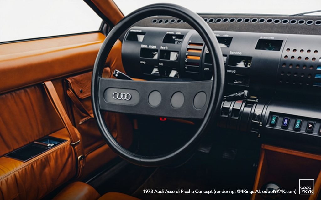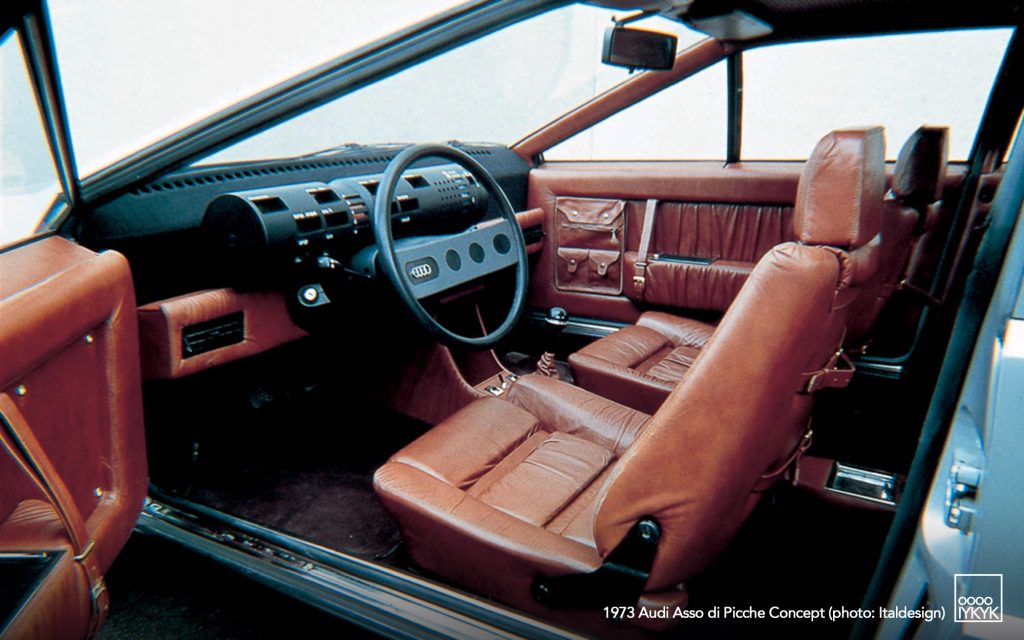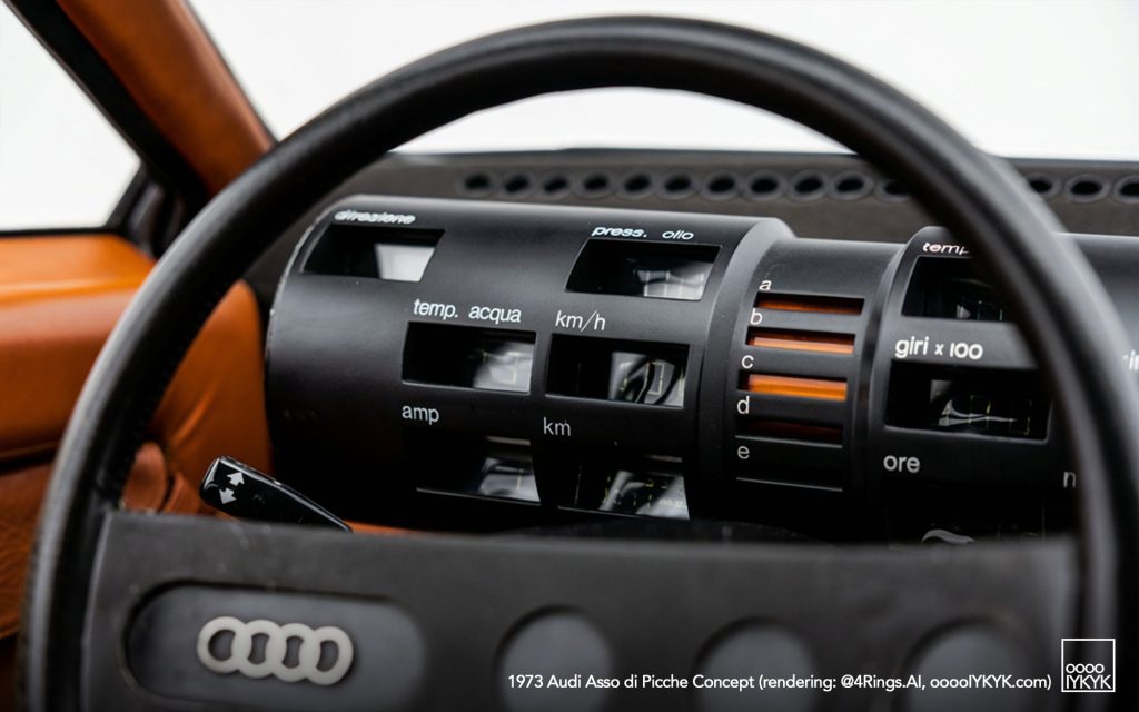 Although the Asso di Picche carried Audi branding and utilized Audi mechanical components from the 80 (B1), it was not commissioned directly by Audi. Instead, it functioned as a design and engineering proposal initiated at Karmann’s request, serving as a rolling showcase of Italdesign’s emerging geometric design language and Karmann’s production capabilities.
