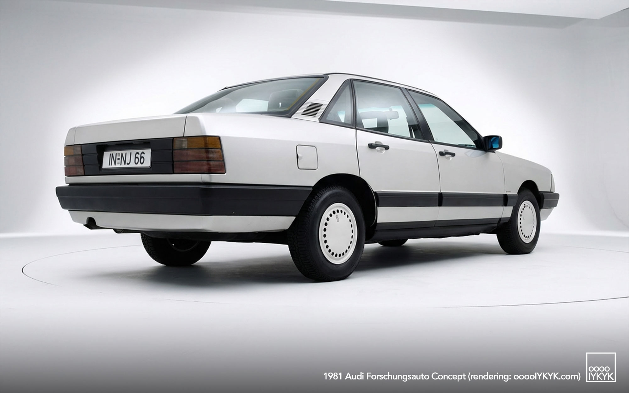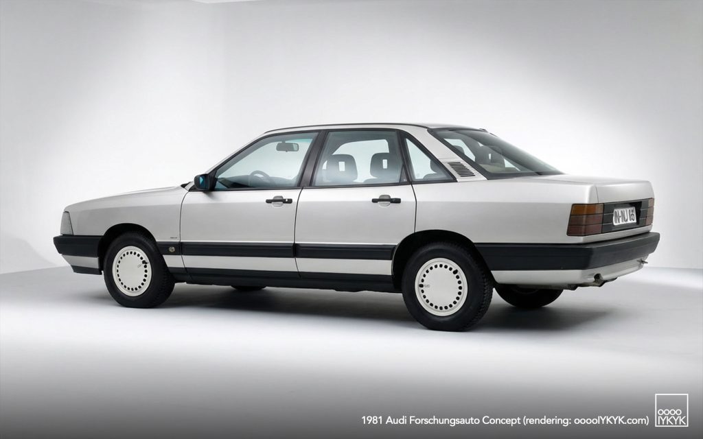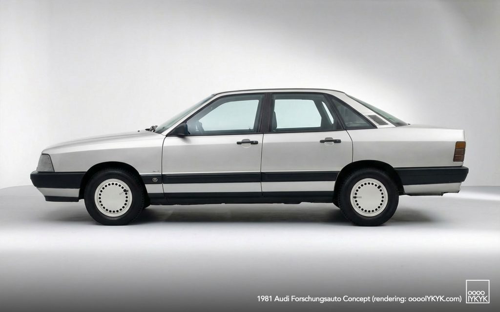 The Forschungsauto’s exterior design is closely tied to the early development of the Audi 100 C3. By late 1979, three proposals for the next-generation Audi 100 were under evaluation by Volkswagen management: a hard model from Italdesign and two clay proposals from Audi designers Martin Smith and Karl Witowski under design chief Hartmut Warkuss. While Witowski’s proposal ultimately became the foundation of the production Audi 100 C3, Smith’s design—with its beltline inspired by the NSU Ro80—was repurposed by Ferdinand Piëch for the experimental research car.