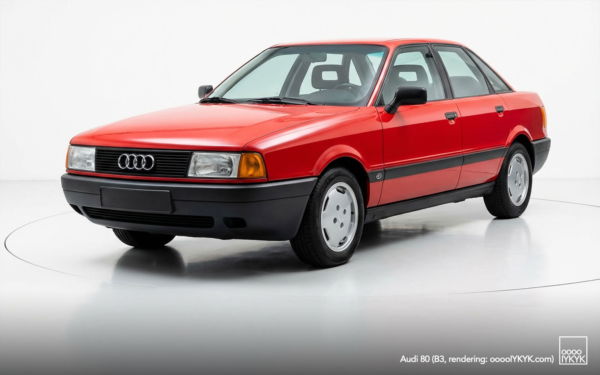 The Audi 80 (B3), internal designation Typ 89 and later Typ 8A, is the third generation of the Audi 80 compact executive sedan. Produced from 1986 to 1991 (and closely related variants through the mid-1990s), it marked a major technological and design shift for Audi, introducing a fully galvanized bodyshell, improved aerodynamics and a revised platform that separated the model from its long-running mechanical association with the Volkswagen Passat. Revealed at the 1986 International Motor Show (IAA) in Frankfurt, the B3 became one of Audi’s most influential models of the late 1980s, selling 1,287,799 units during its production run.