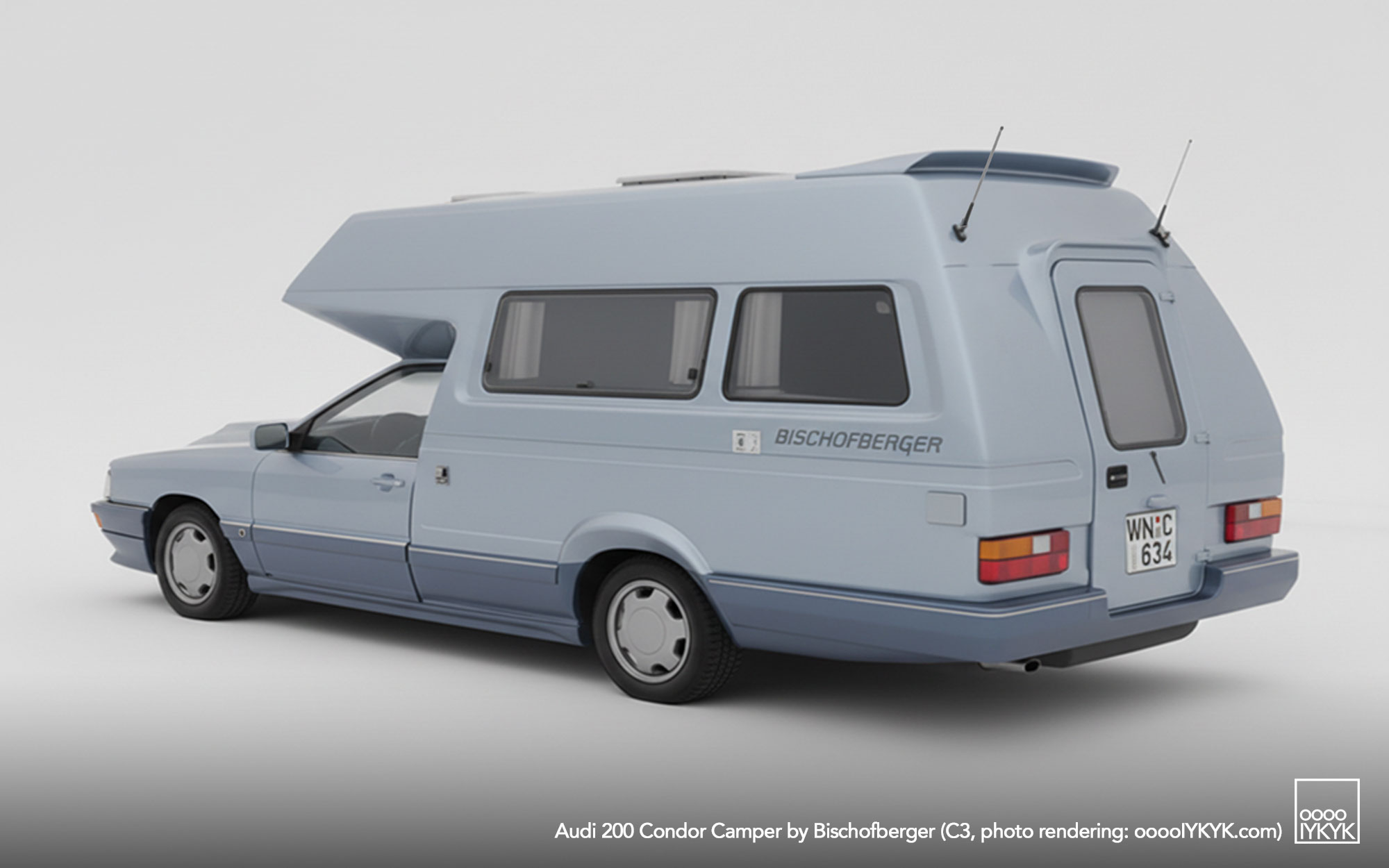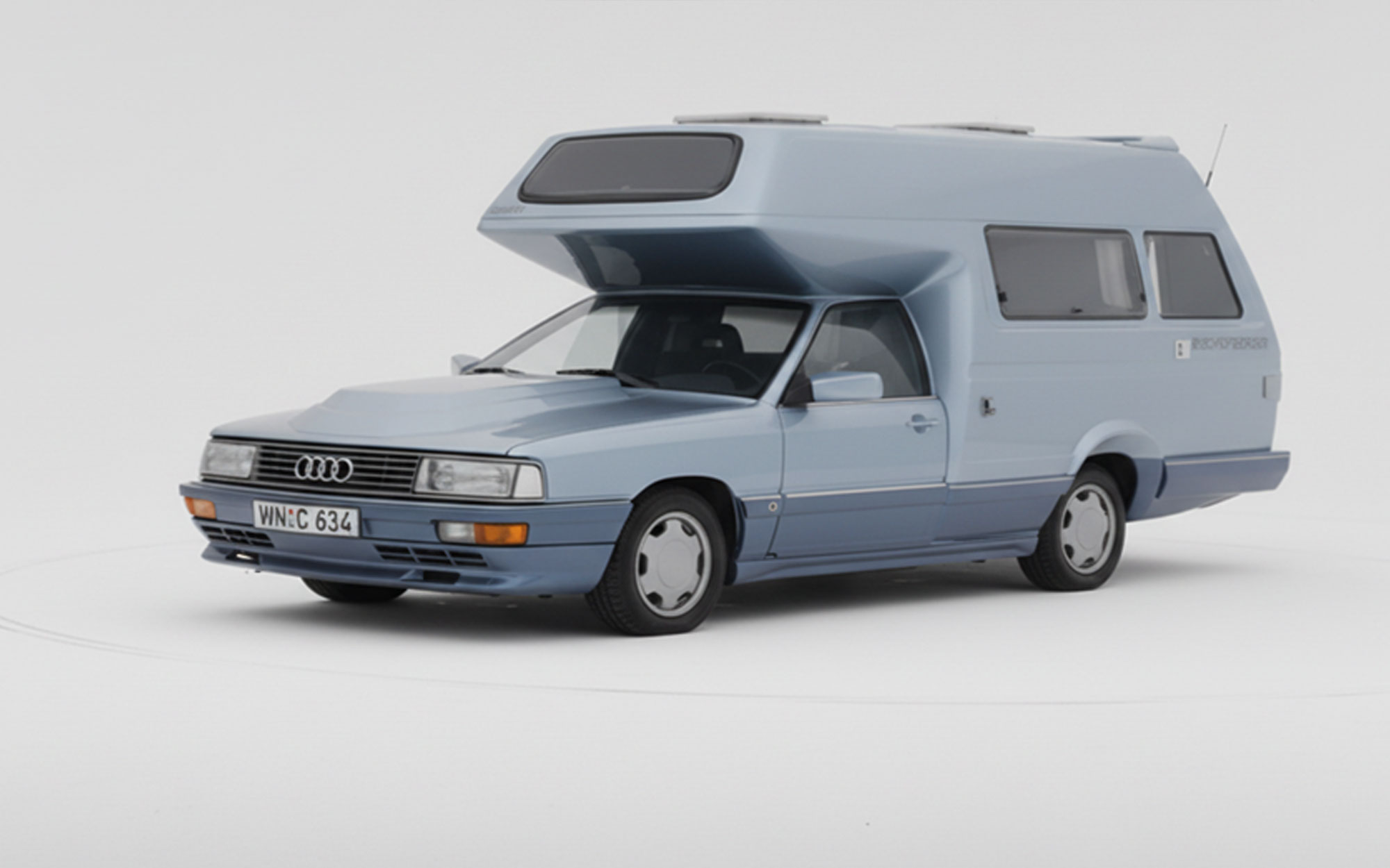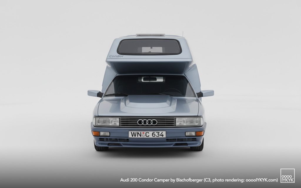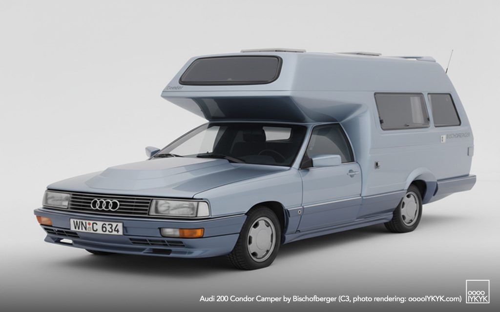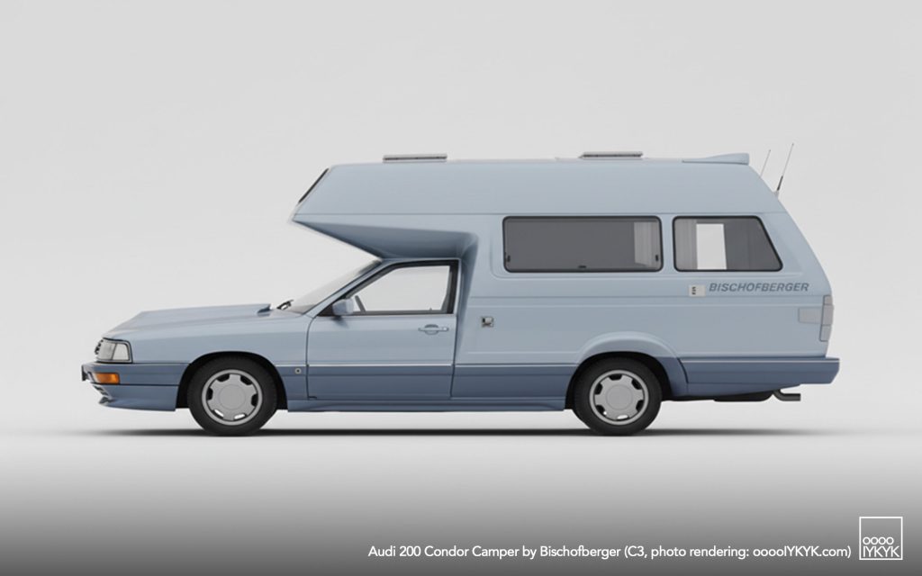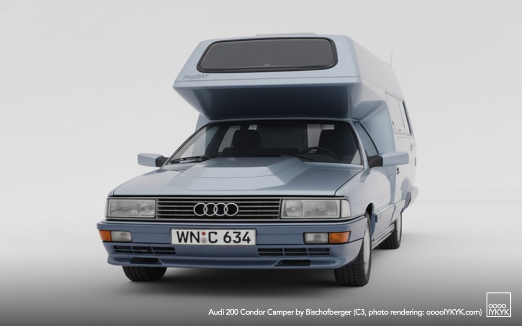 After establishing the sedan-based camper idea with the Audi 100 Family (C2 and C3), Helmut Bischofberger pushed the concept to its logical extreme by selecting the more powerful Audi 200 as a base. The Audi 200, positioned above the Audi 100 in the model hierarchy, offered turbocharged five-cylinder power and higher cruising capability—key attributes for Bischofberger’s vision of a motorhome that could travel as quickly and comfortably as a premium executive car.