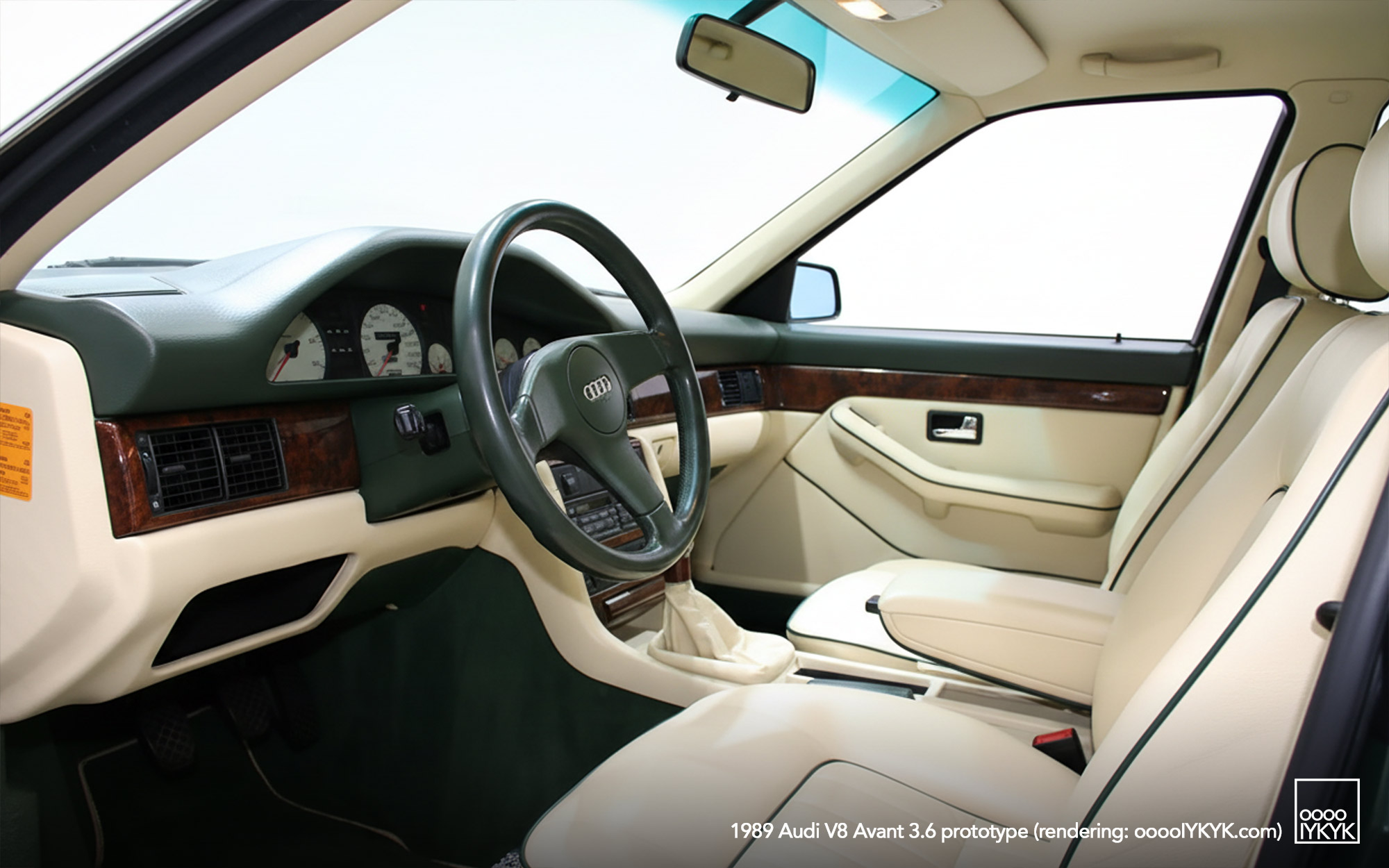 The interior received Audi’s “Classic Line” luxury package, an early precursor to bespoke customization. Magnolia-colored Connolly leather upholstery with green piping covered the seats and interior panels, complemented by a quilted beige leather headliner. Additional touches included wood veneers, a split-folding rear seat, coordinated green trim plastics, and a removable luggage cover. The result was a hand-finished cabin reminiscent of a luxury atelier rather than a conventional prototype.