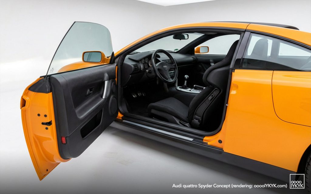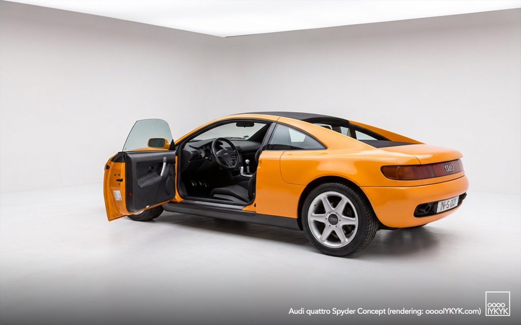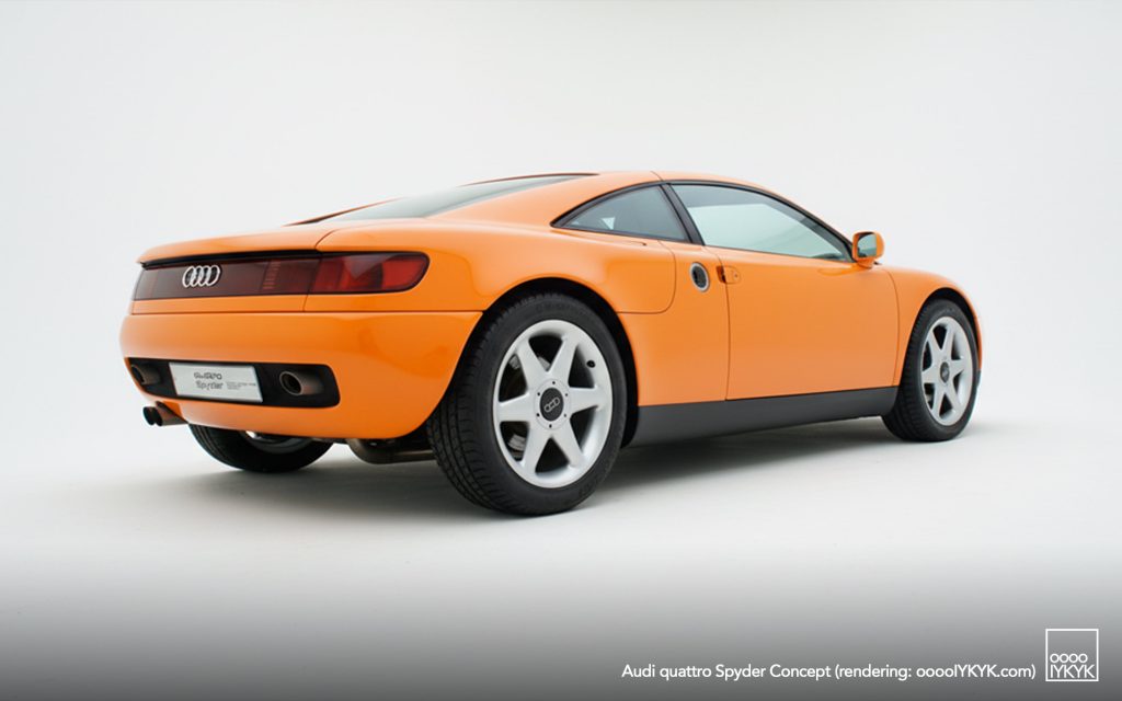 Introduced at the 1991 Frankfurt Motor Show, the Spyder was presented as a fully functional prototype, not merely a static design exercise. Audi explicitly positioned it as a study capable of series production without fundamental changes, while targeting a relatively accessible price point for a mid-engine sports car.