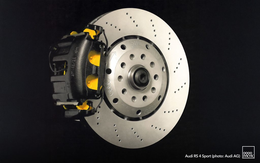 For sustained high-performance driving and racetrack durability, quattro GmbH offered an 18-inch brake system with perforated (“drilled”) composite brake discs and higher-friction, track-oriented pads. These components provided improved resistance to fade at the expense of increased noise and dust during normal use.