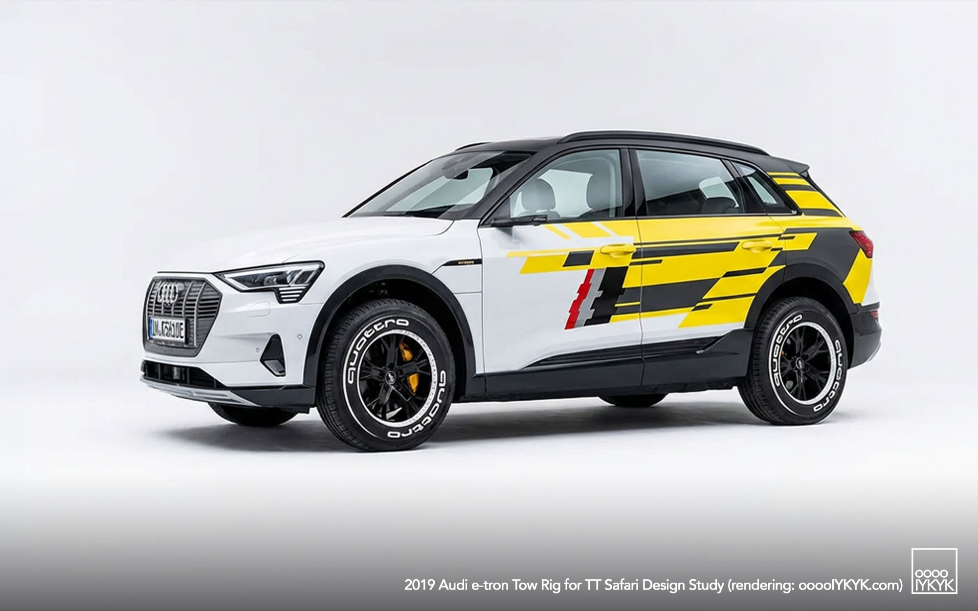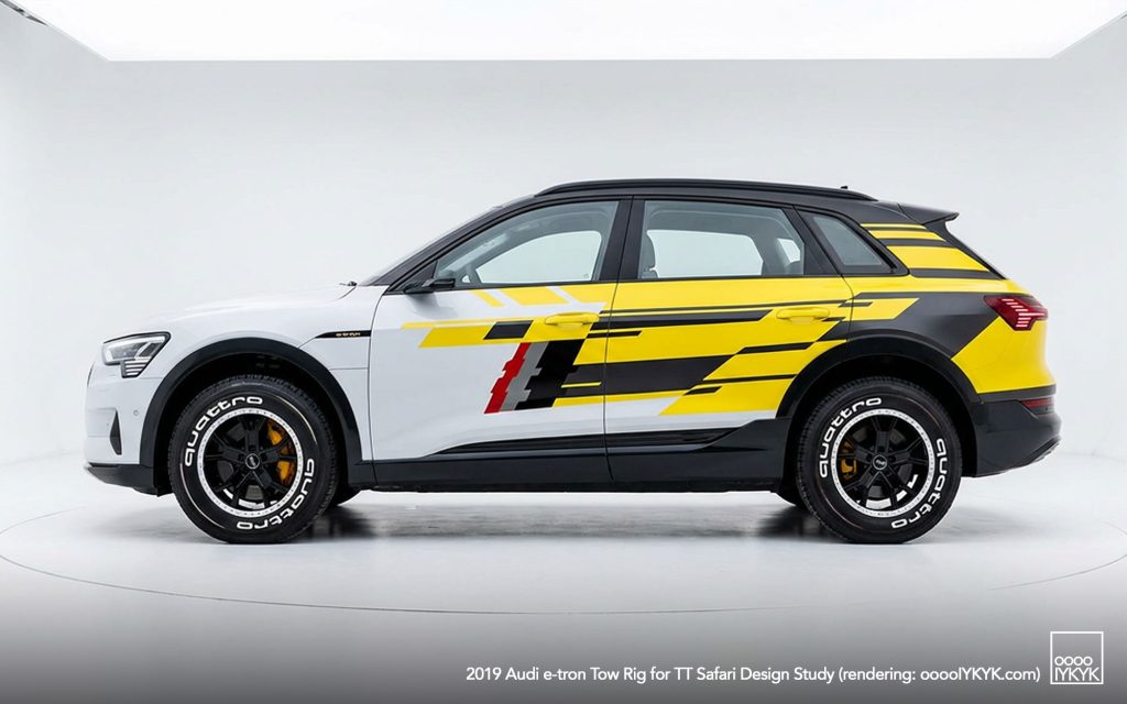 The e-tron Safari Tow Concept featured a bespoke livery echoing the TT Safari’s color scheme, with contrasting tones and yellow accents applied to bodywork. Exterior modifications focused on visual ruggedness and event utility rather than structural off-road conversion.