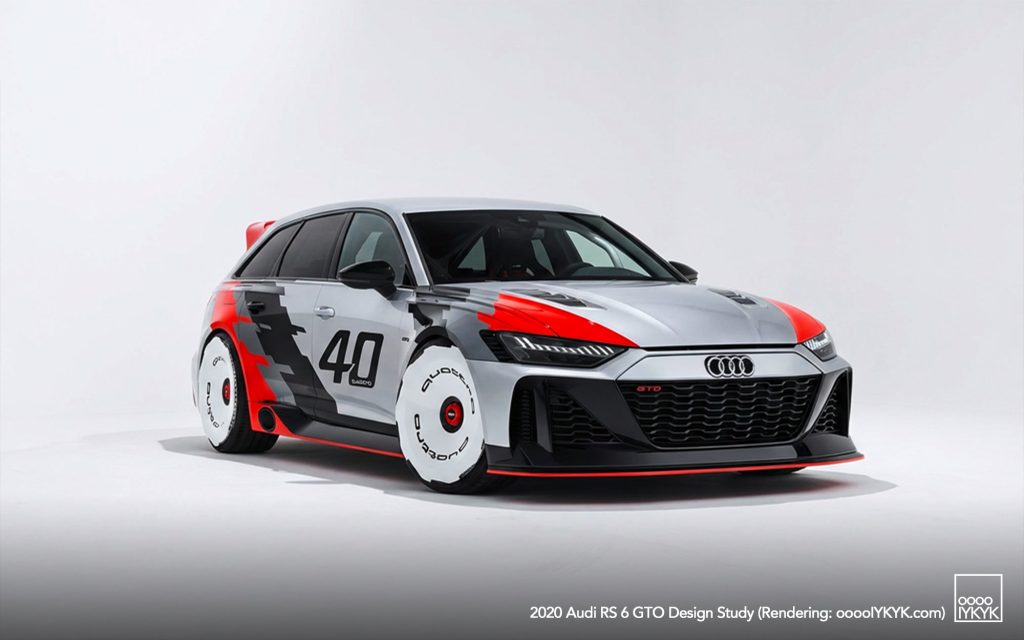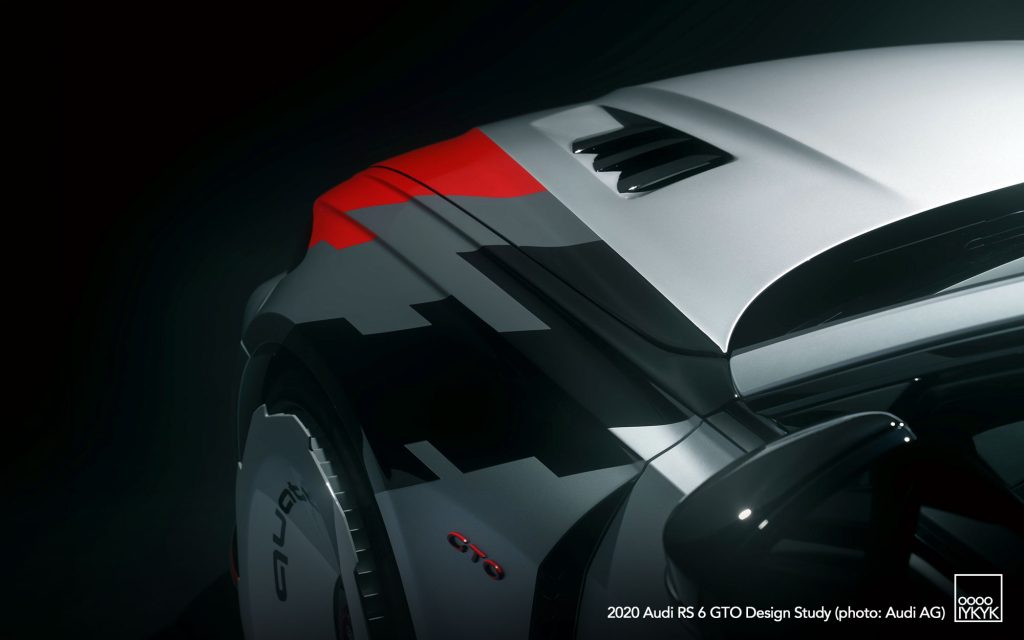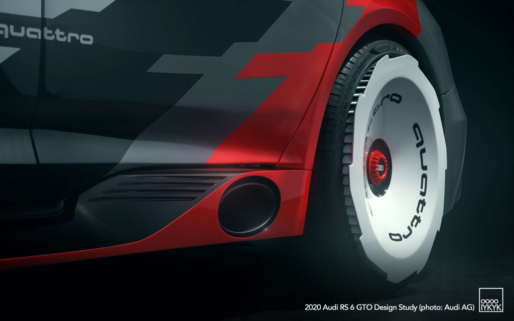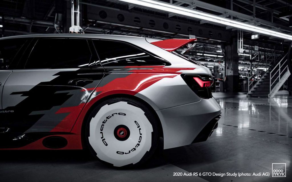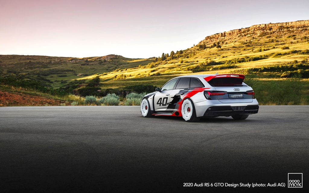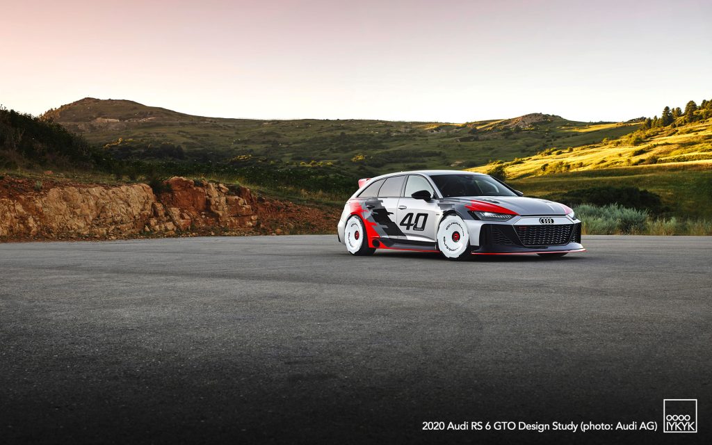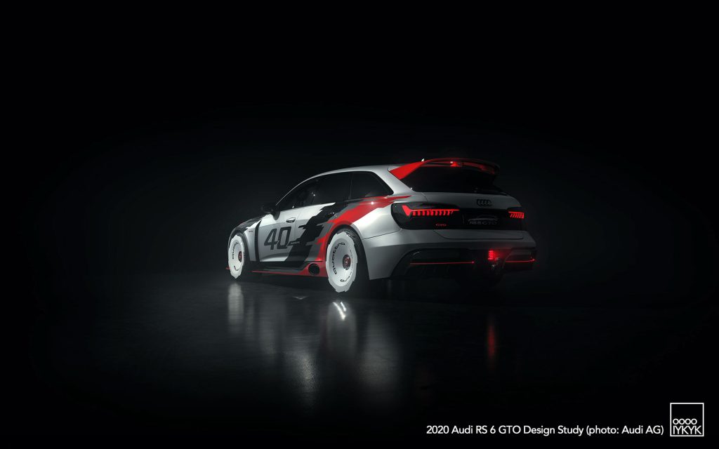 The RS 6 GTO Concept pays direct homage to the Audi 90 quattro IMSA GTO, a competition car built for the 1989 IMSA GTO championship in the United States. That race car became known for its boxy fender flares, aggressive aerodynamics, and distinctive red, white, and gray livery.