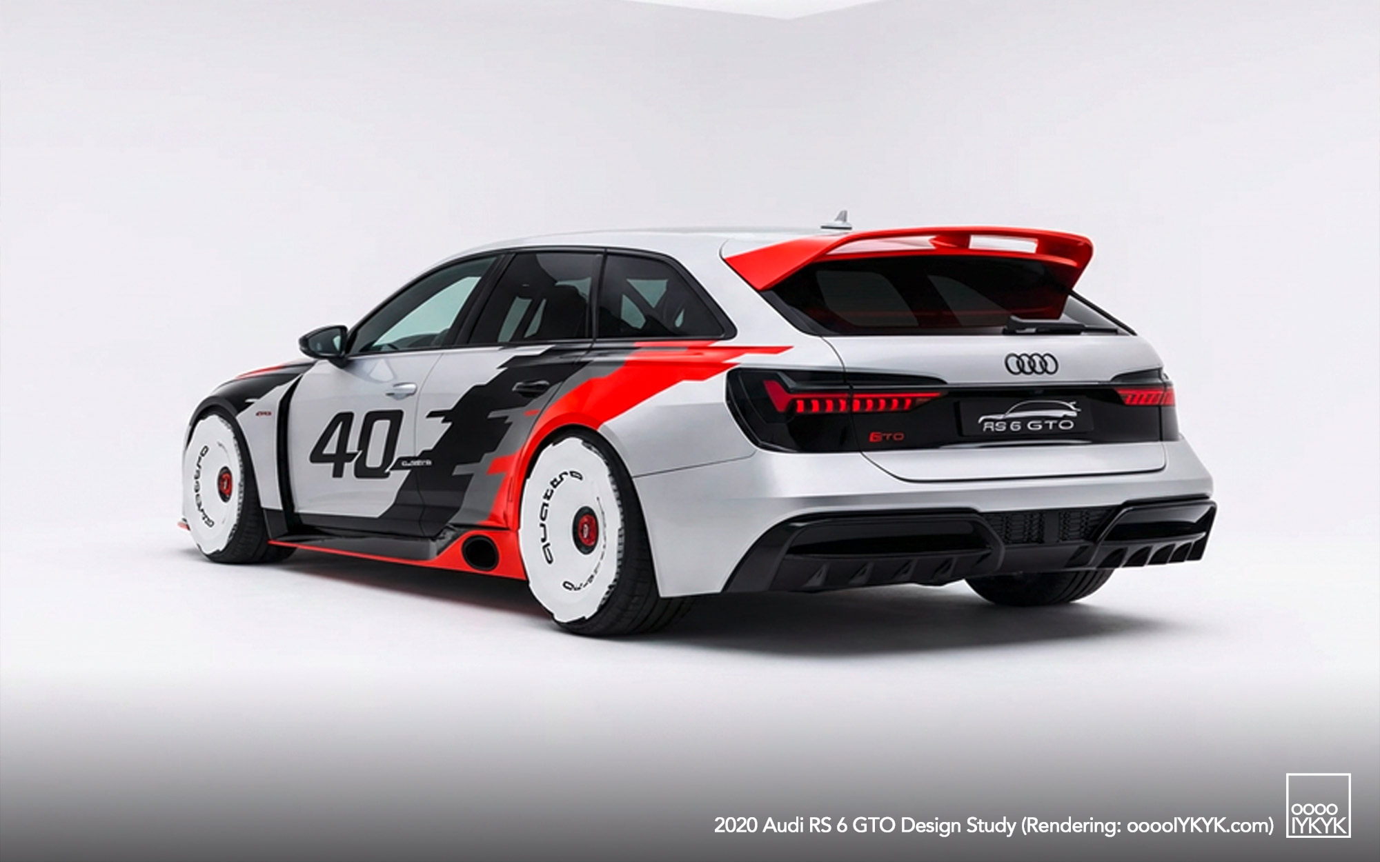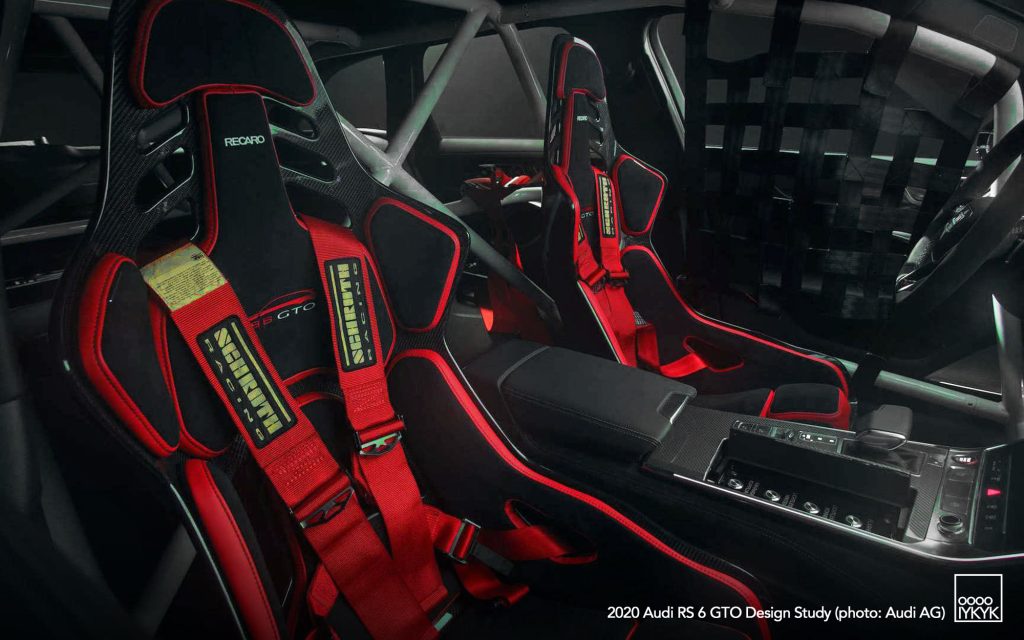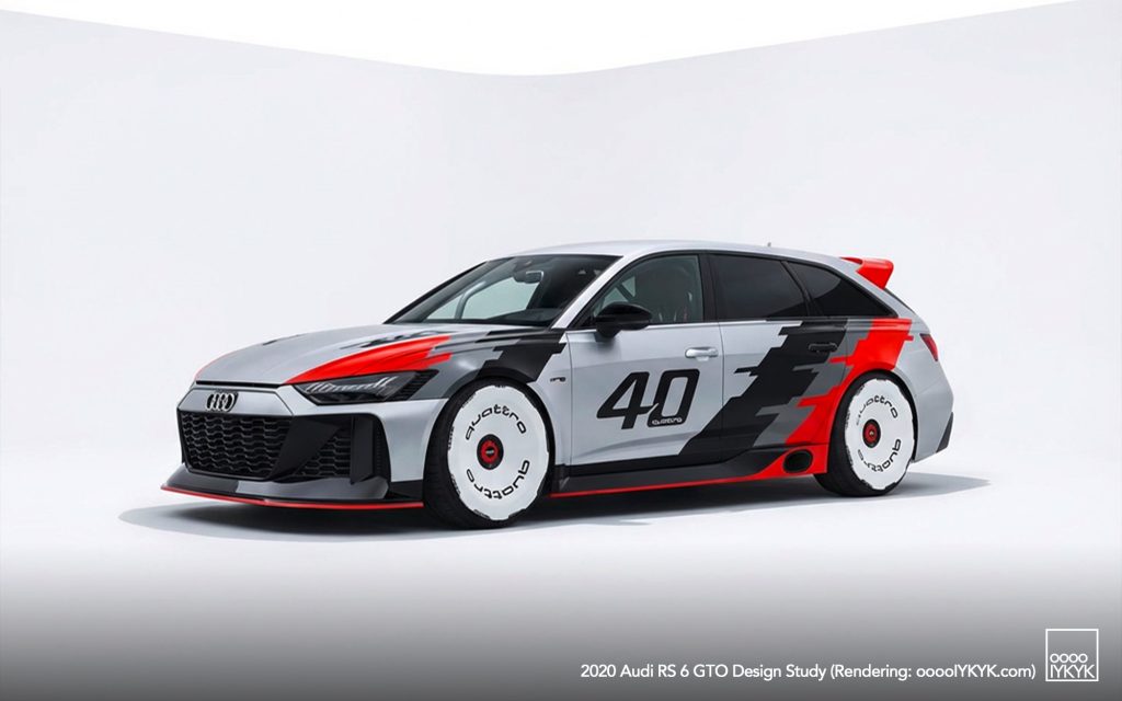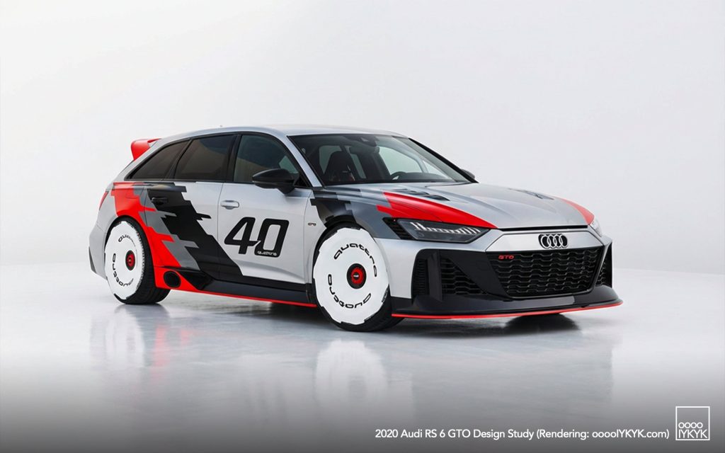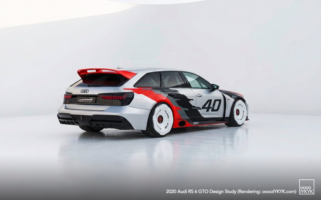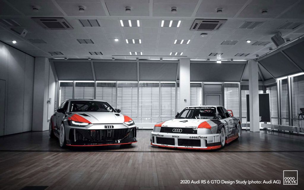 The RS 6 GTO Concept pays direct homage to the Audi 90 quattro IMSA GTO, a competition car built for the 1989 IMSA GTO championship in the United States. That race car became known for its boxy fender flares, aggressive aerodynamics, and distinctive red, white, and gray livery.