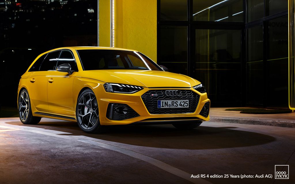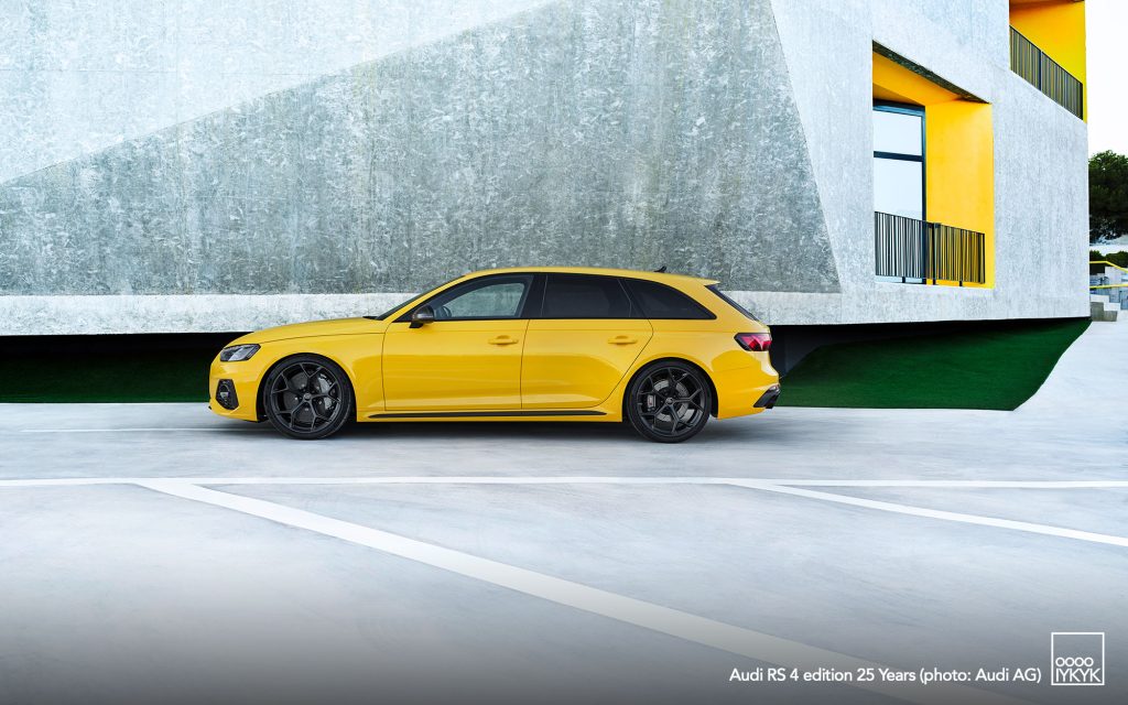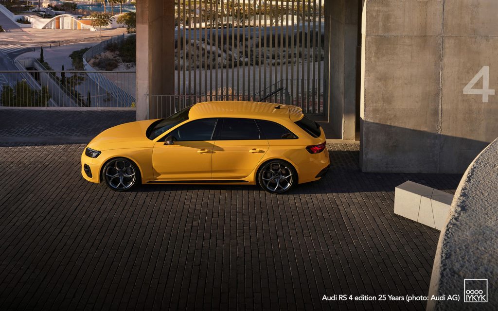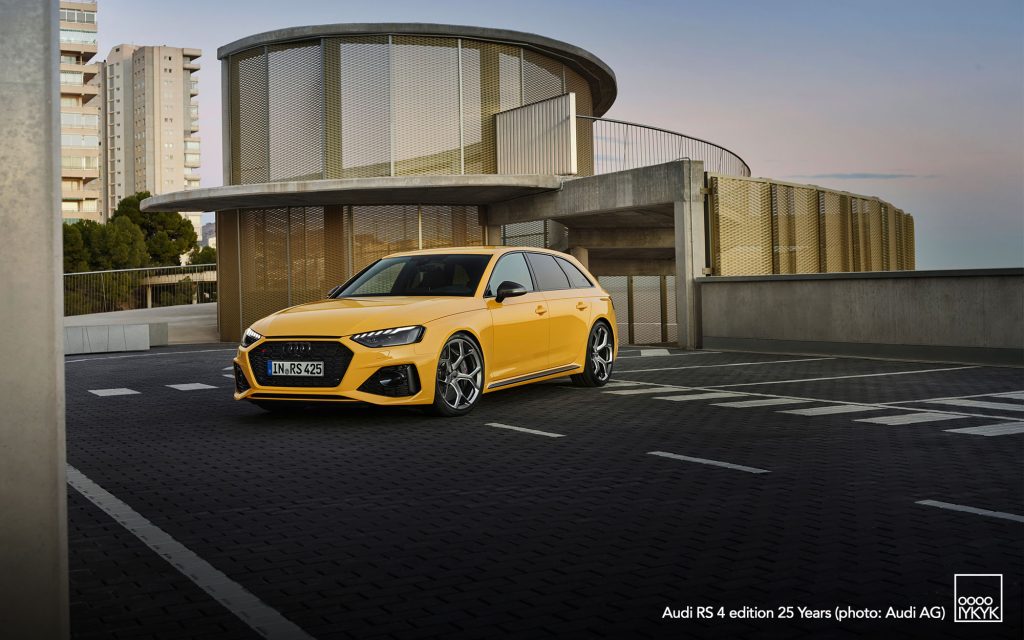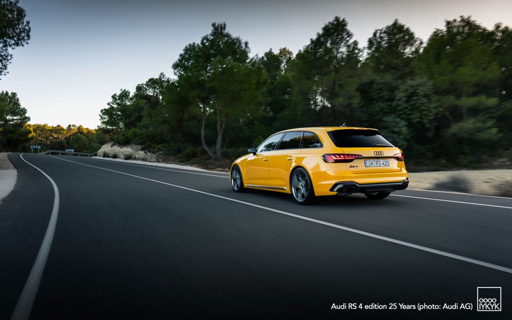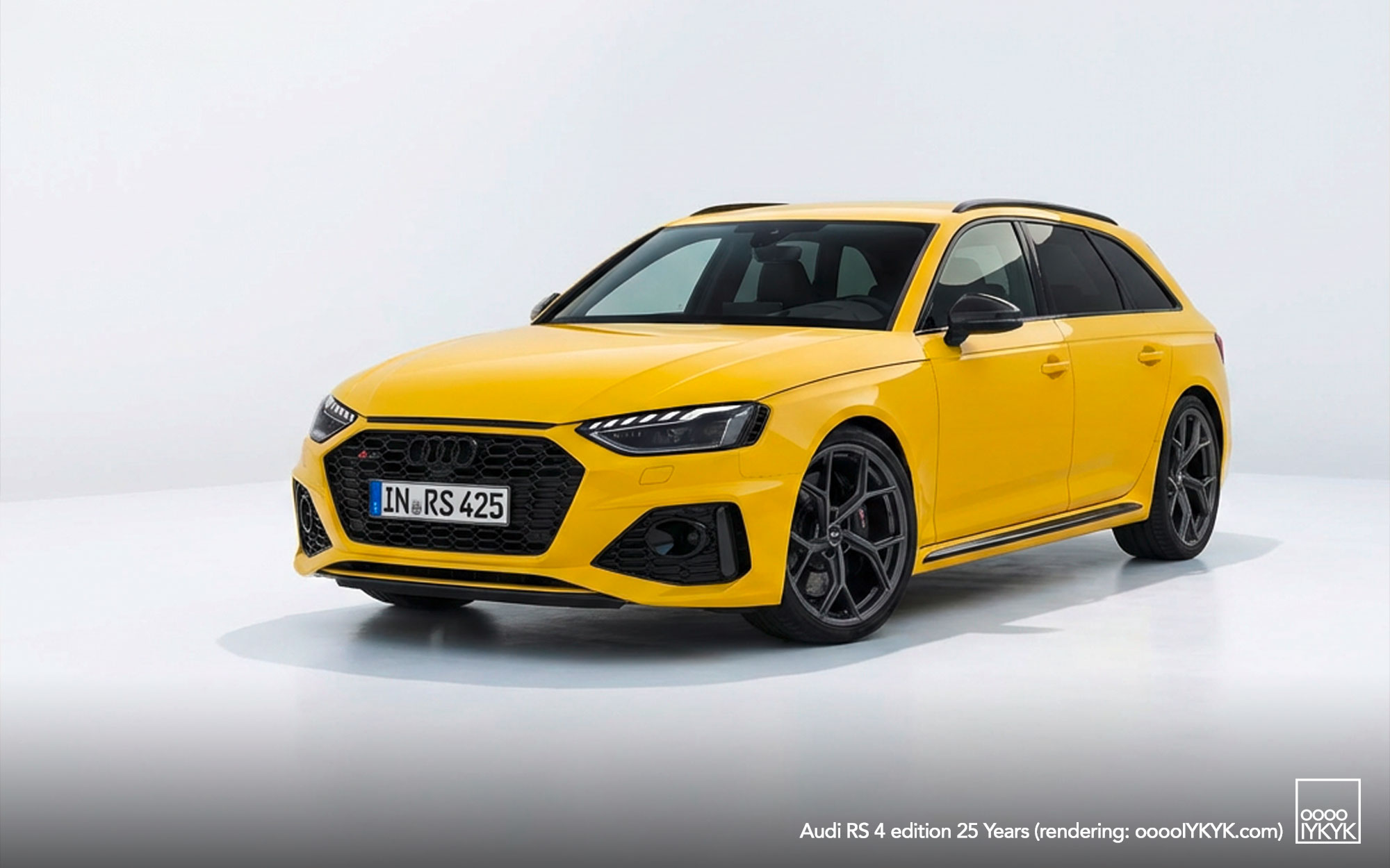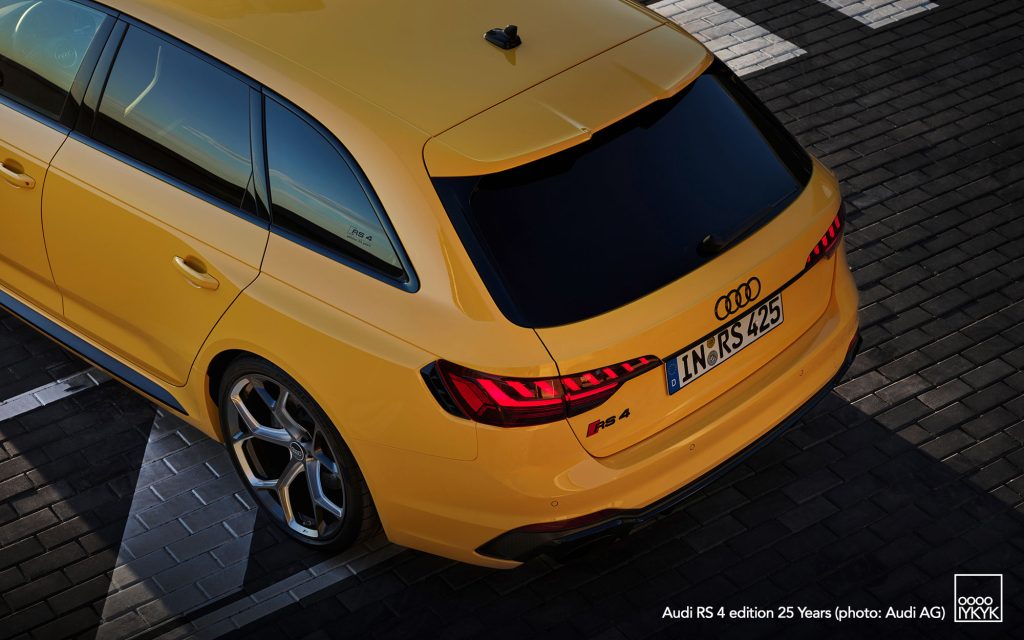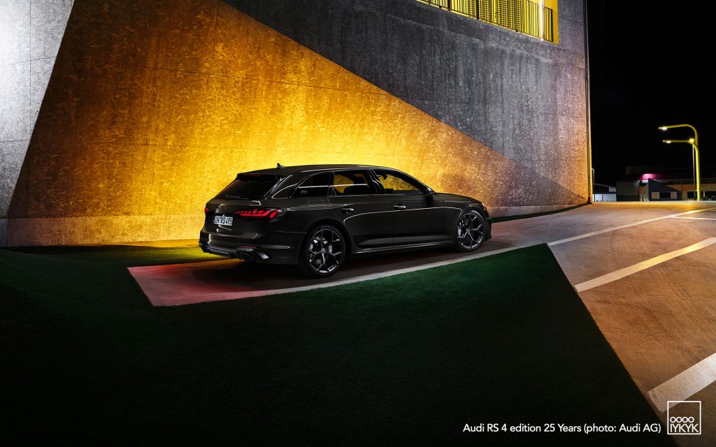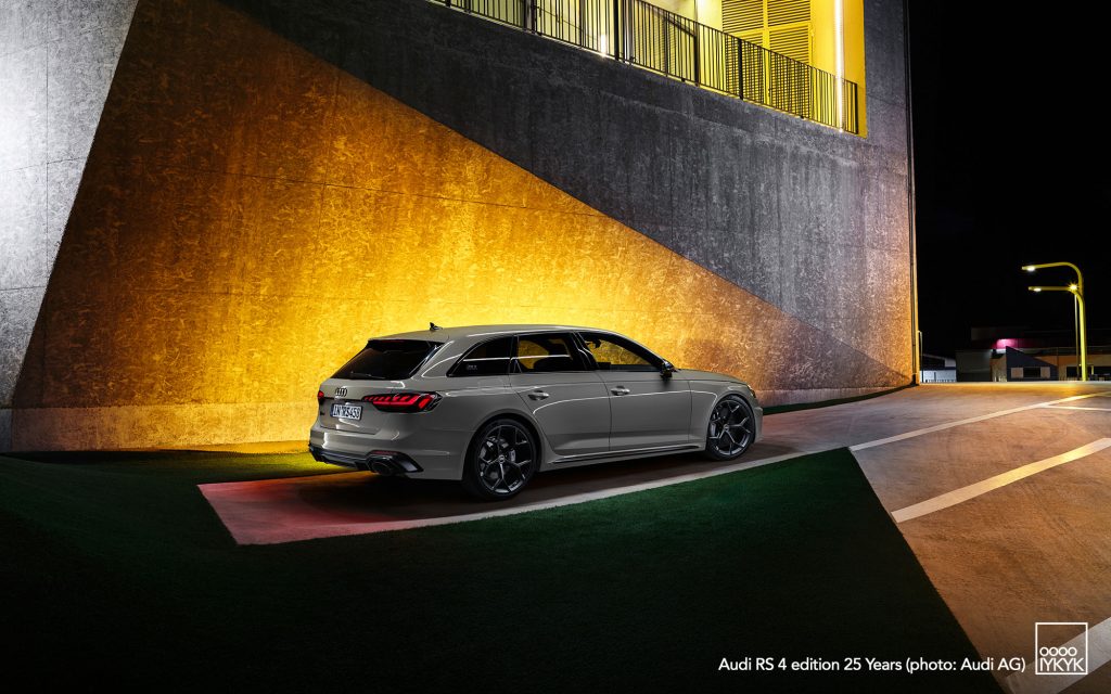 The Audi RS 4 Avant edition 25 years is a limited-production high-performance estate car introduced in 2024 to commemorate the 25th anniversary of Audiโs RS 4 model line. Developed by Audi Sport GmbH and Audi exclusive, the edition serves as the performance flagship of the B9-generation A4 series and pays visual and conceptual tribute to the 2001 RS4 Sport of the first-generation RS 4 (B5). Production is limited to 250 units for Europe, with each vehicle individually numbered.
