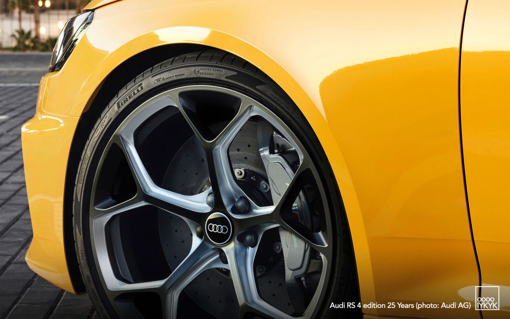 The edition 25 years is delivered with 20-inch forged alloy wheels in Palladium matte, derived from the RS 4 competition package and further weight-optimized through additional machining. Wheel offset is widened from ET 22 to ET 18 for a more aggressive stance.