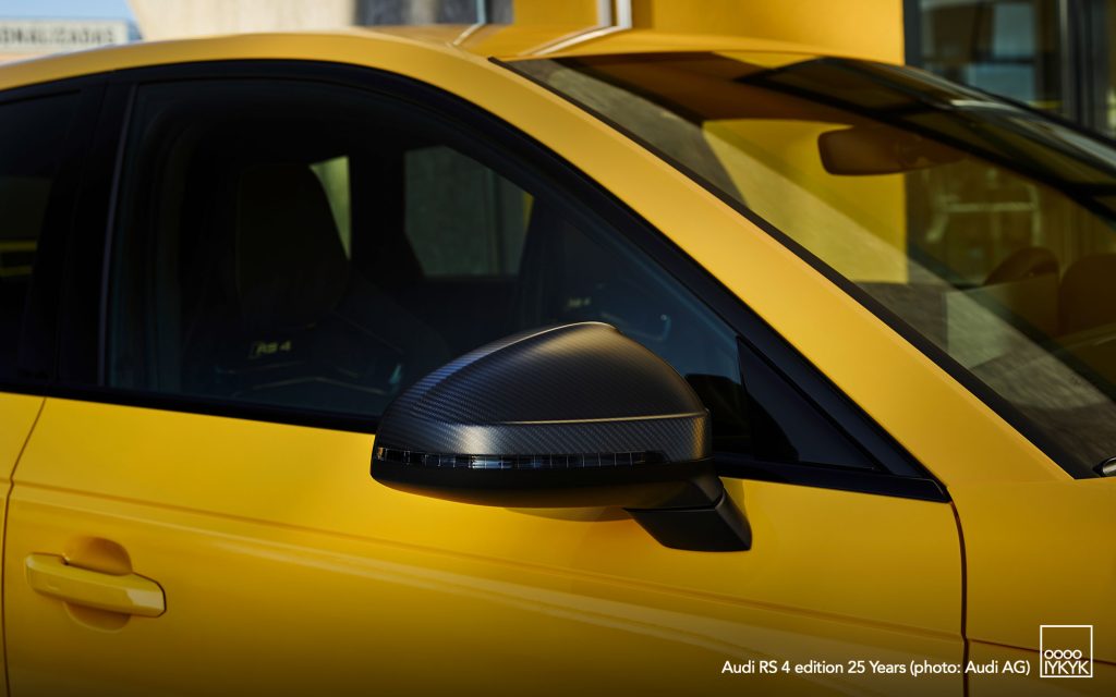 - Yellow Audi Sport rhombus and RS logos replacing the traditional red-black color scheme