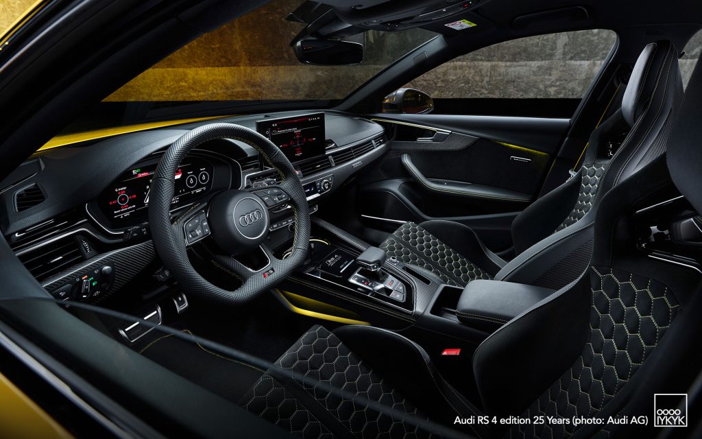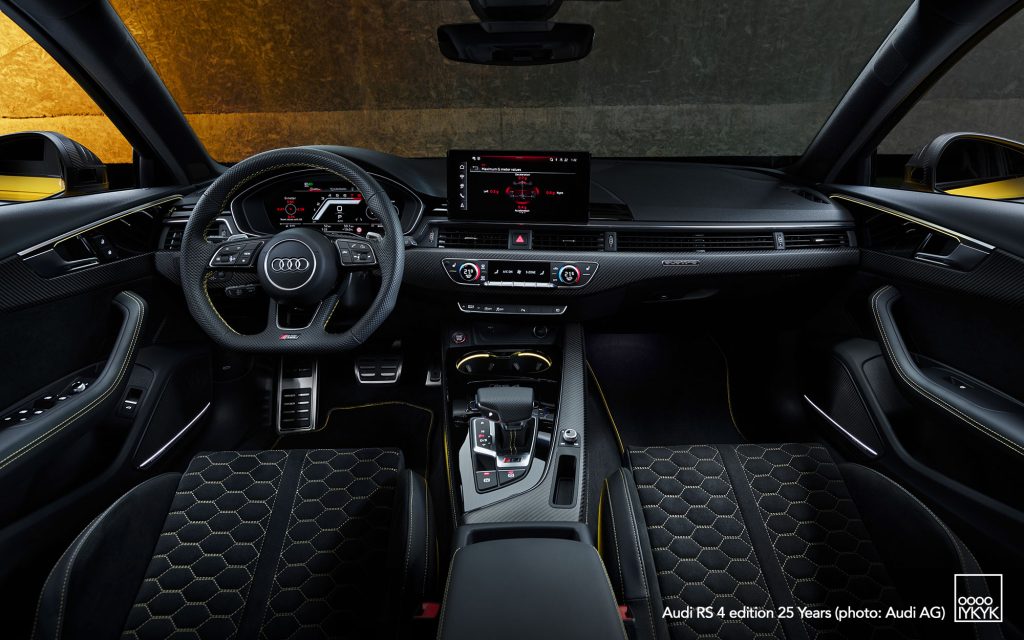 The interior design heavily references the yellow-accented black leather and Alcantara of the RS4 Sport (B5). Features include: