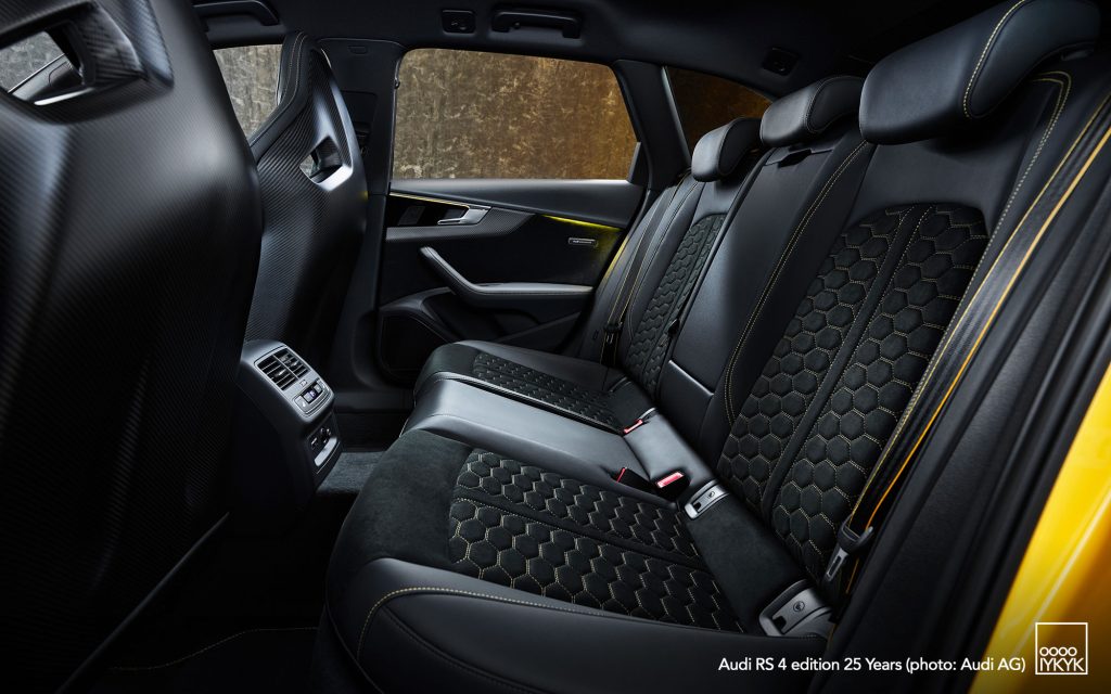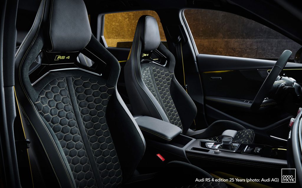 - RS bucket seats with carbon backs, honeycomb stitching, and yellow RS 4 embroidery