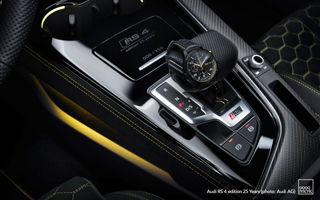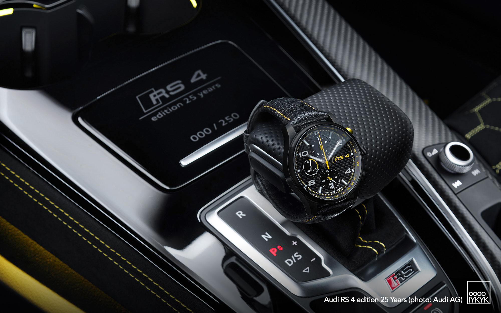 Audi collection introduced a matching RS 4 Avant edition 25 years chronograph, limited to 250 units and styled to reflect the carโs details. It features: