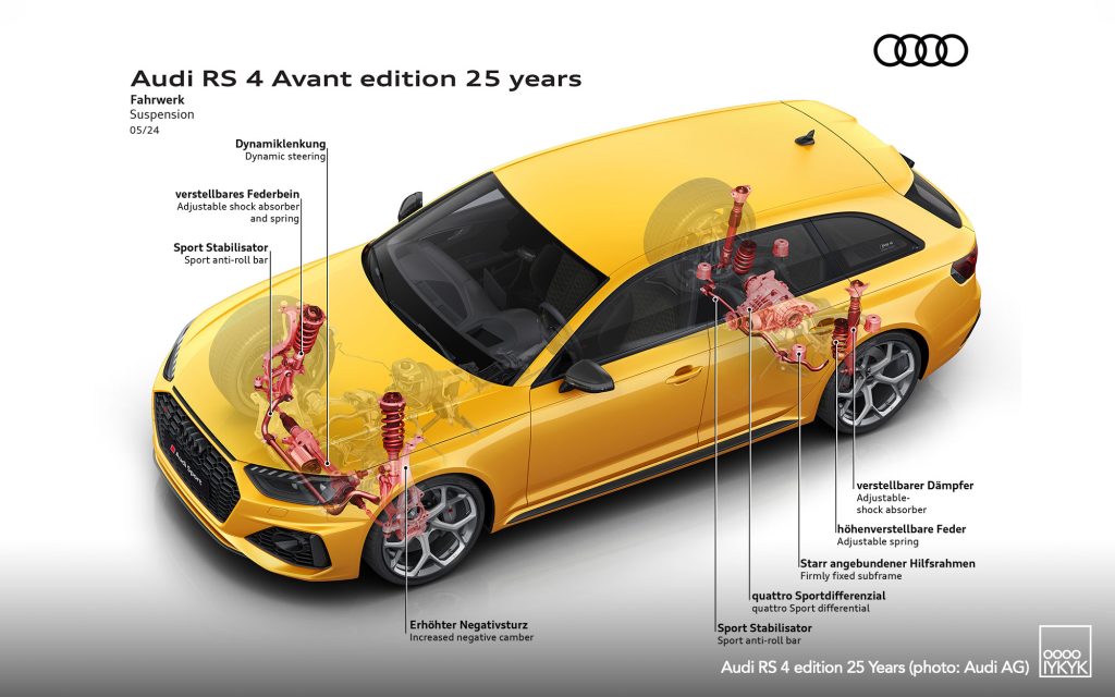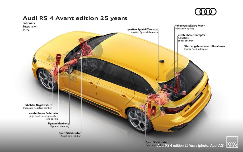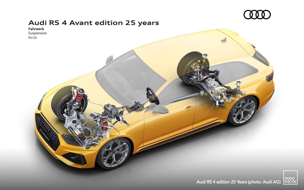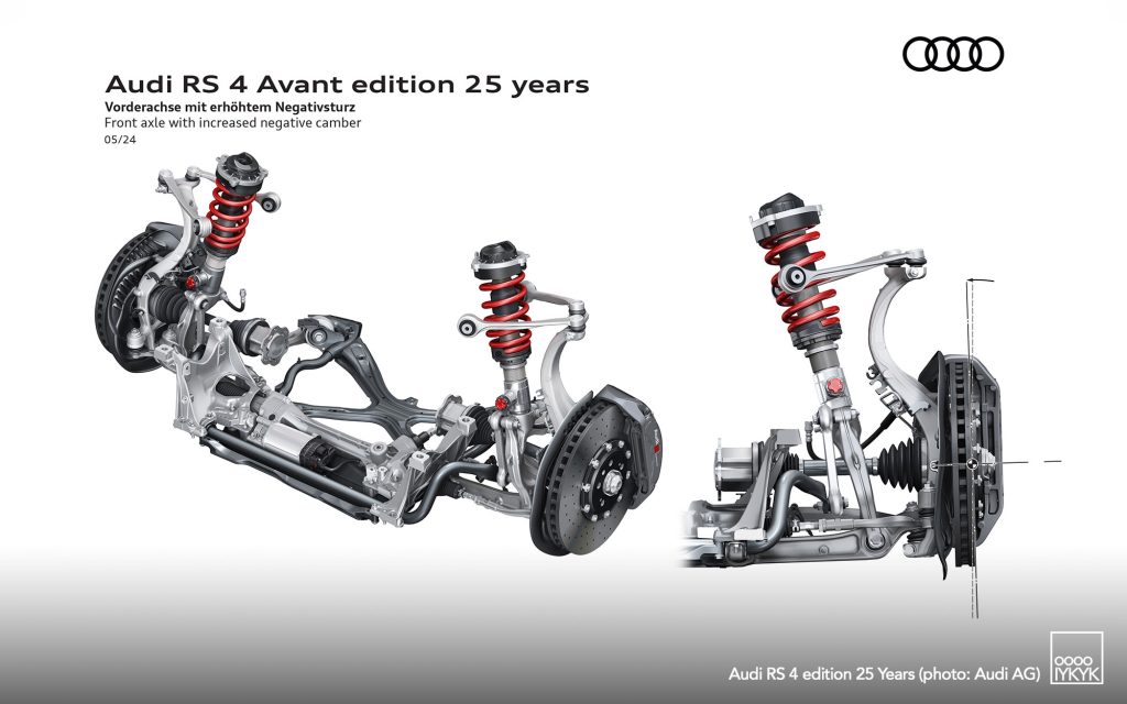 The anniversary edition is equipped with RS sport suspension pro, a manually adjustable coilover system sourced from KW offering both performance and comfort tuning. The model sits 10 mm lower than the standard RS 4 Avant and can be manually lowered an additional 10 mm, yielding a total drop of 20 mm.