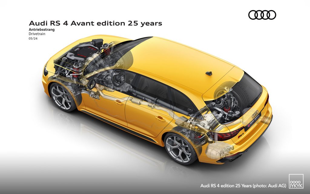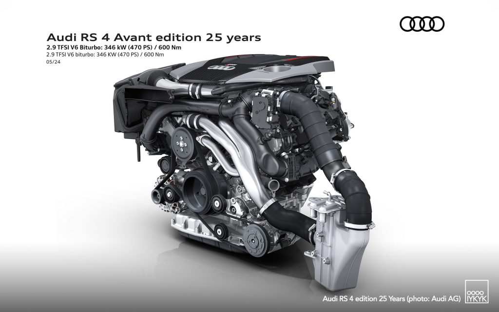 The RS 4 Avant edition 25 years is powered by an uprated 2.9-litre V6 biturbo engine producing 346 kW (470 PS) and 600 Nm of torqueโan increase of 15 kW (20 PS) over the standard RS 4 Avant. Performance figures include: