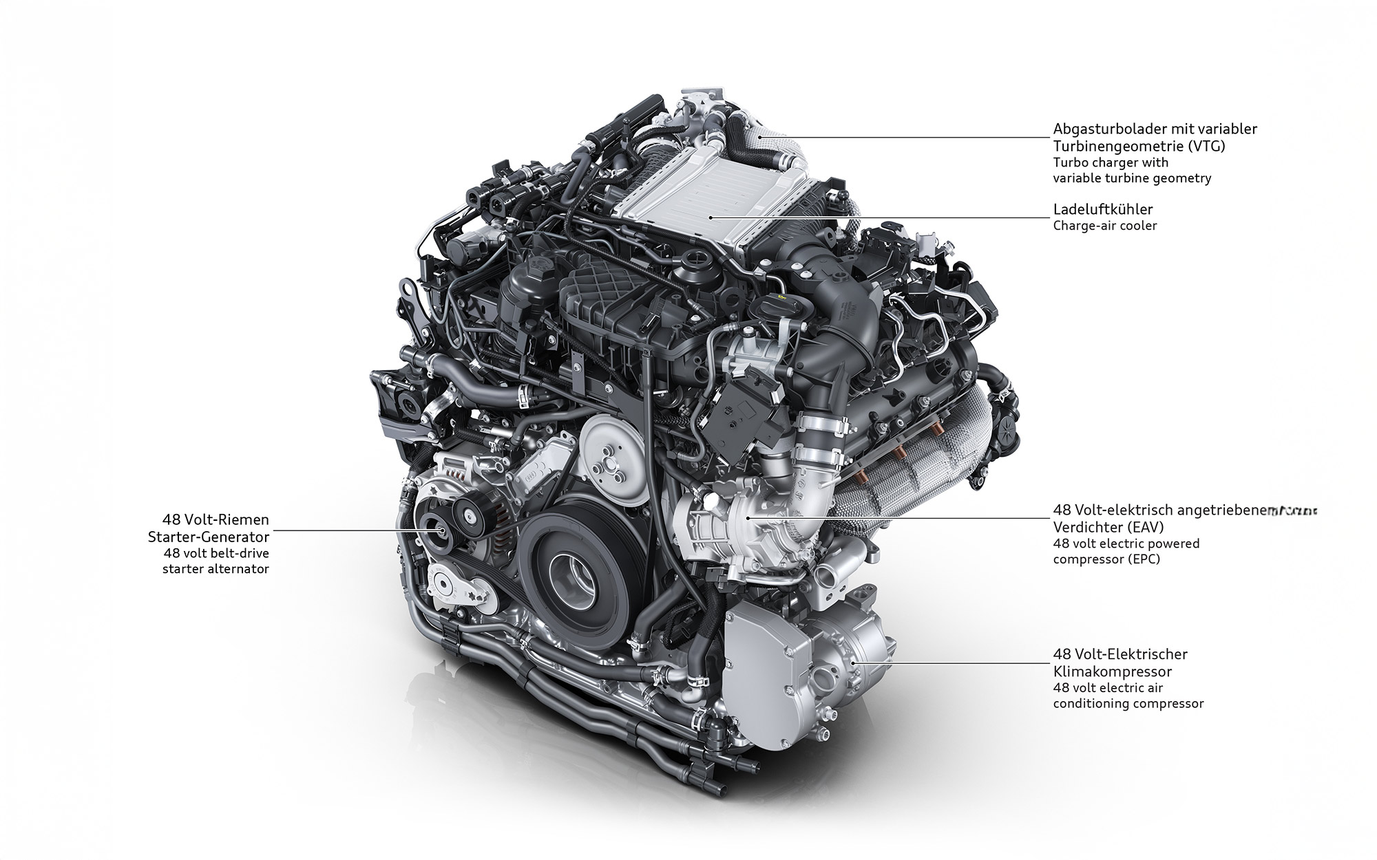 The Audi 3.0 V6 TDI (EA897evo4) is a diesel engine introduced by Audi in 2025 for use in the facelifted Audi Q5 and Audi A6. It represents a significant evolution of the EA897 engine family, combining a revised three-liter V6 TDI with an expanded MHEV plus mild-hybrid system and a second-generation electrically powered compressor (EPC). The powertrain is positioned as a more responsive, more efficient, and cleaner alternative to earlier TDI engines, incorporating sustainable fuel compatibility and enhanced electrification.