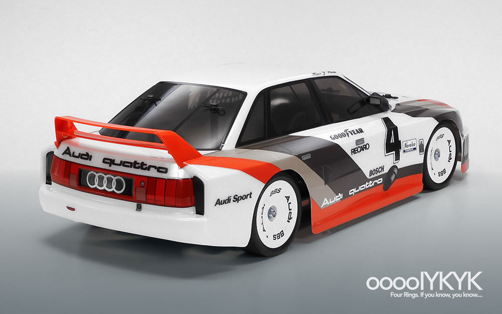 Sold as a kit requiring assembly, this remote-controlled model of the Audi 90 IMSA GTO includes polycarbonate body. Included stickers recreate the livery racing stripes, sponsor logos and more. Molded parts replicate details such as A-pillar ducts, side mirrors and rear wing. Unique “flat dish” wheels on semi-pneumatic tires replicate the 90 IMSA GTO’s iconic turbofans, while a +4mm offset set them perfectly to the wide bodywork of this particular kit.