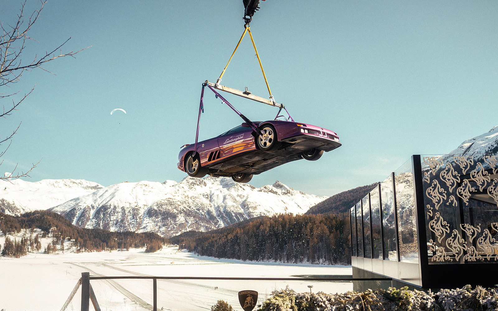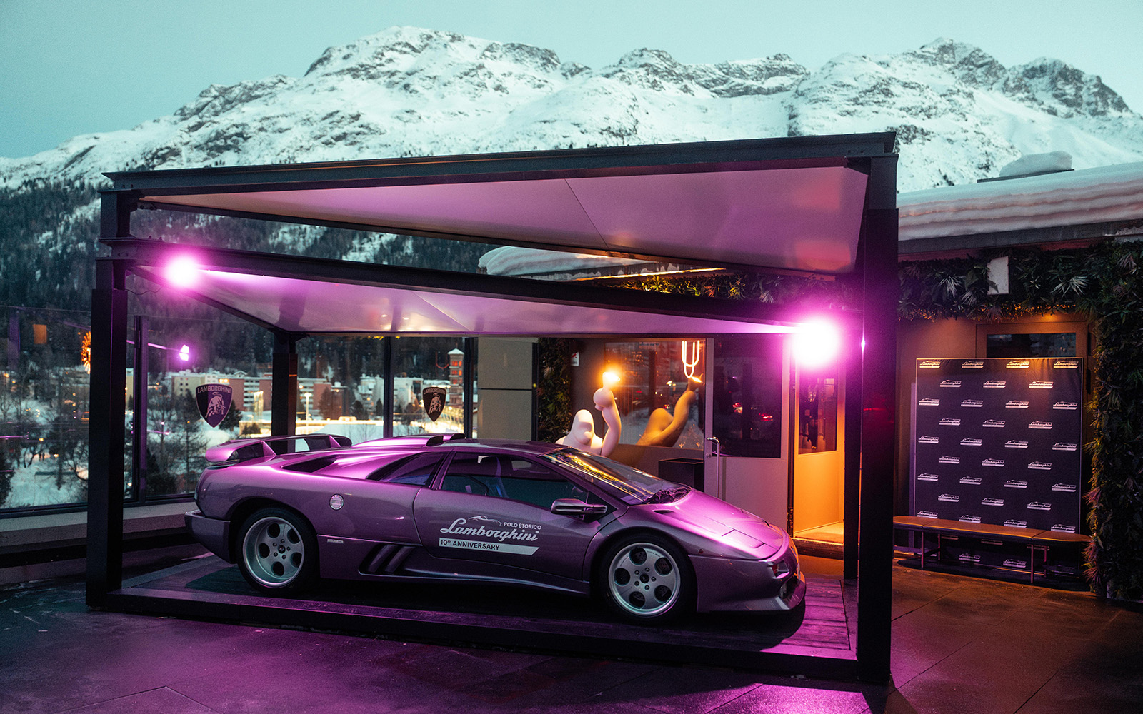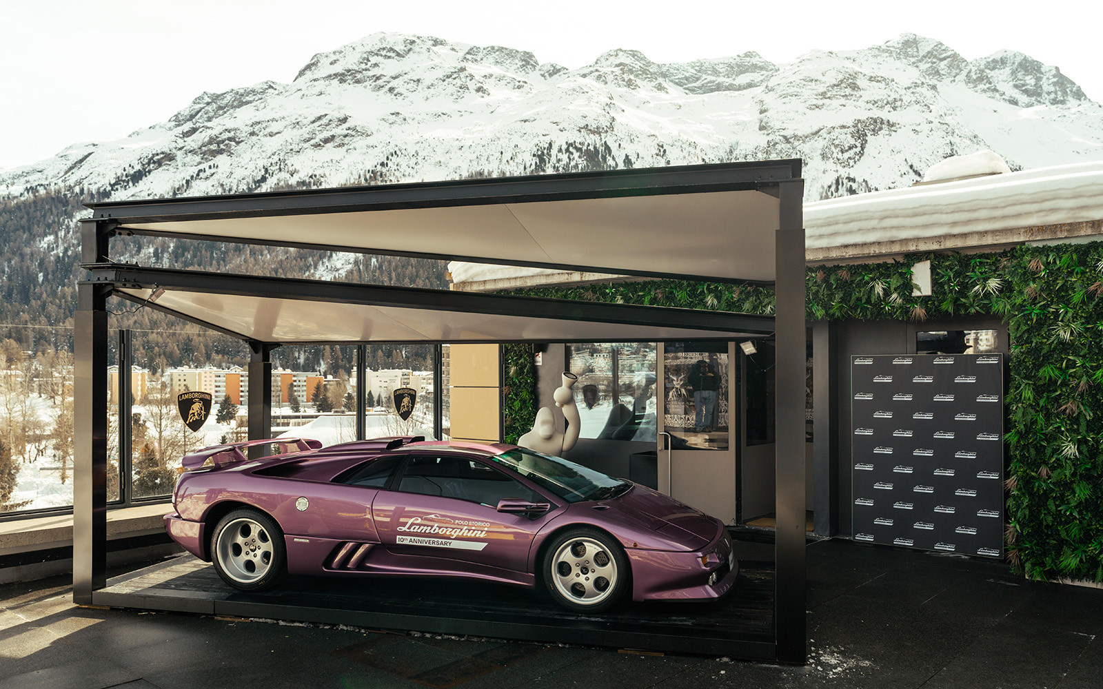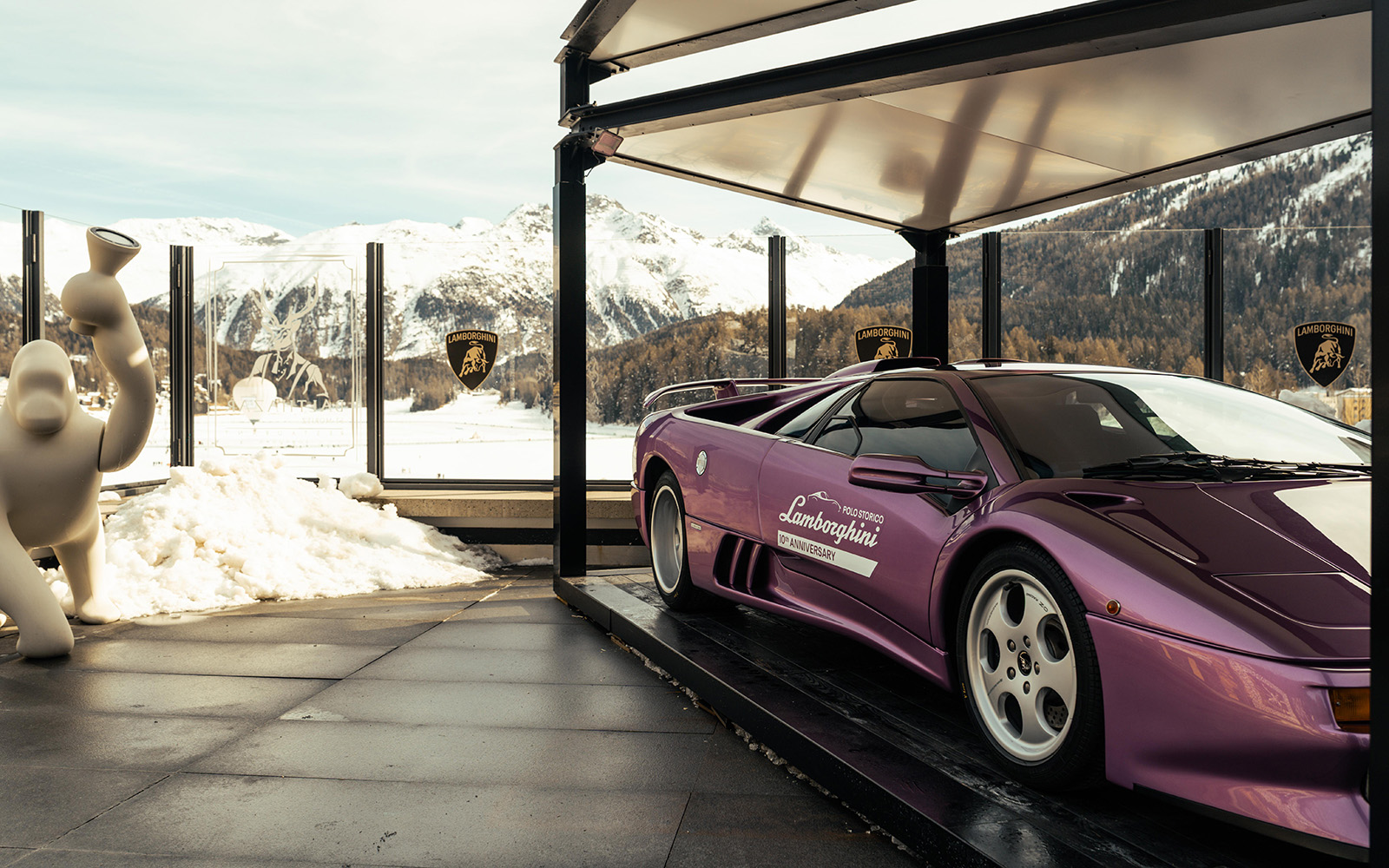 Elsewhere, a Lamborghini erected a Polo Storico Lounge for guests and journalists. Here, they displayed a Diablo SE30 painted the very special color of “Lambo Thirty” a.k.a. Viola 30 – a special purple created for this anniversary Diablo. The car had been lifted via crane to take its place on the panoramic terrace of the Balthazar Downtown and with views of Lake St. Moritz.