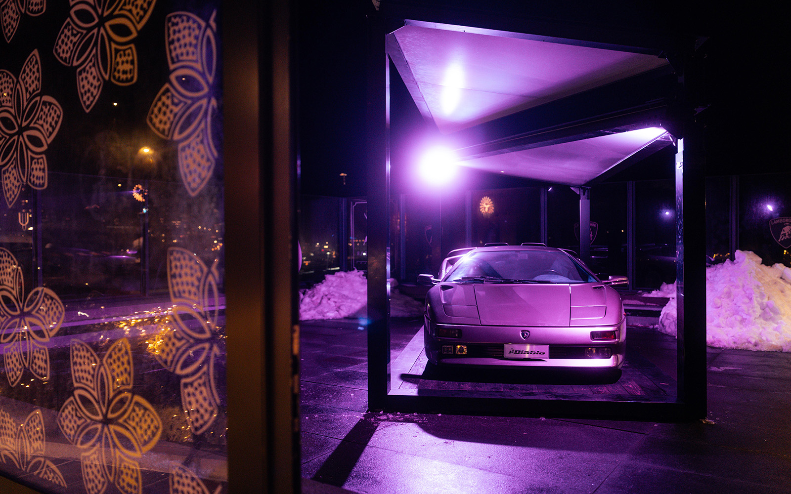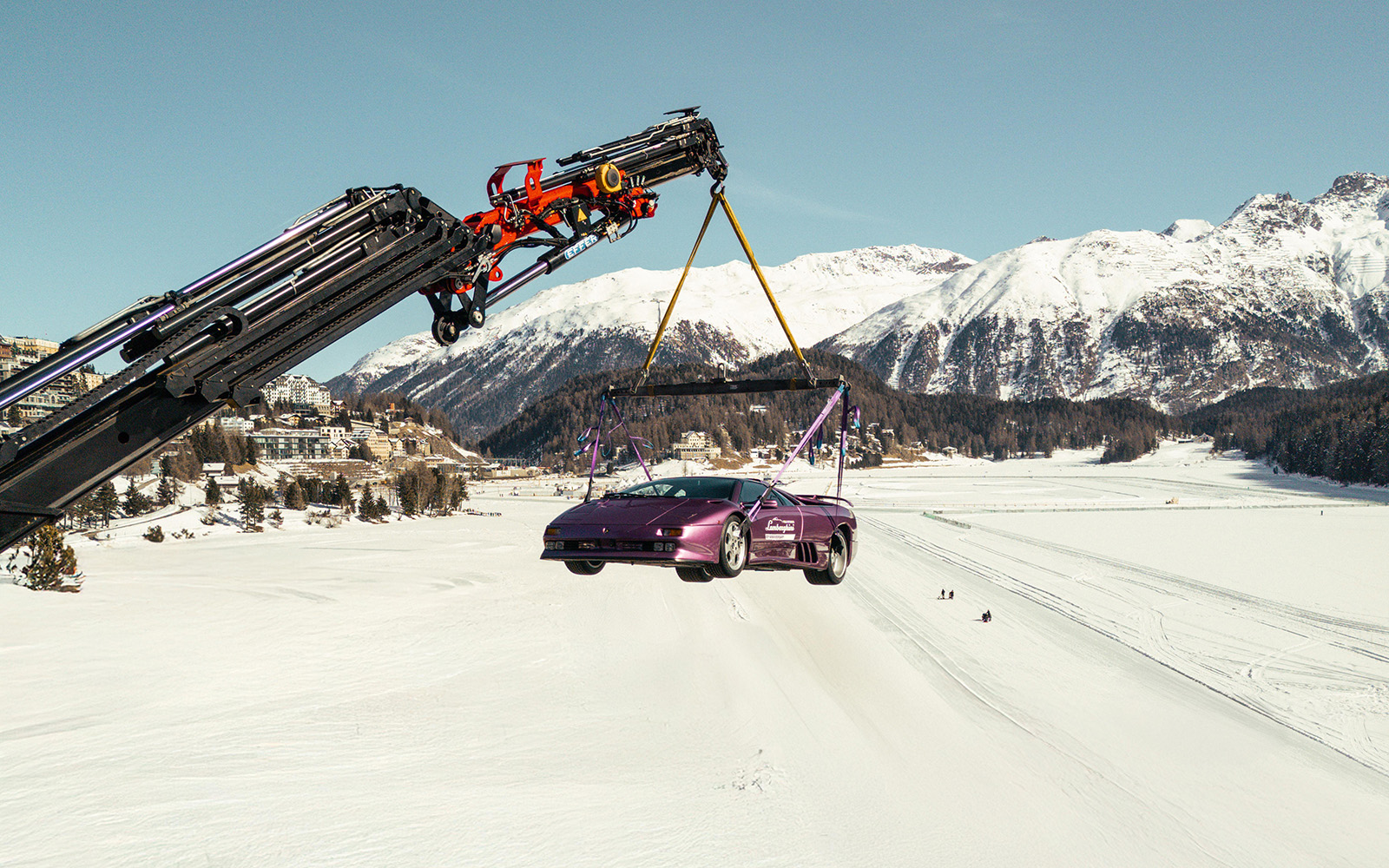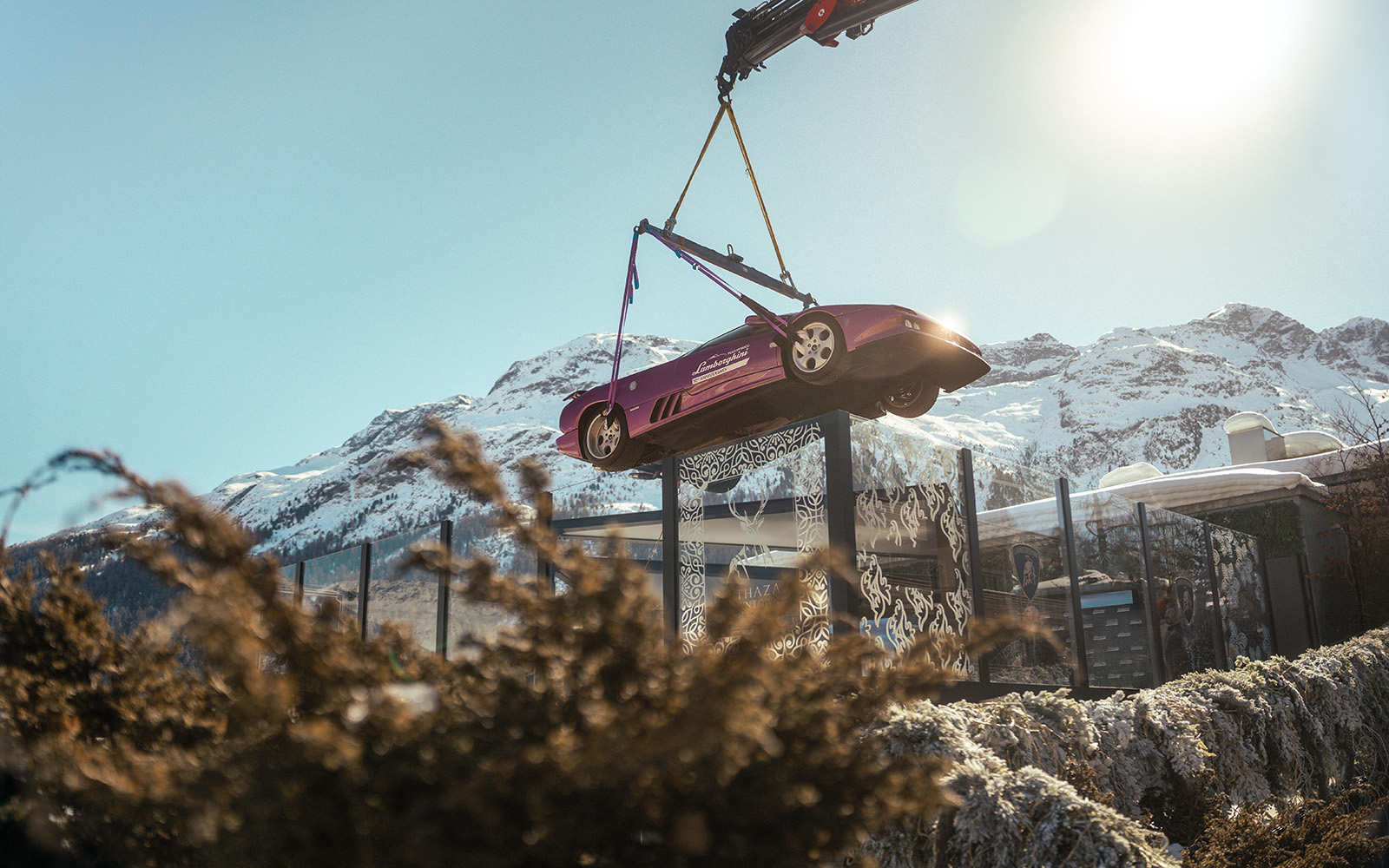 Elsewhere, a Lamborghini erected a Polo Storico Lounge for guests and journalists. Here, they displayed a Diablo SE30 painted the very special color of “Lambo Thirty” a.k.a. Viola 30 – a special purple created for this anniversary Diablo. The car had been lifted via crane to take its place on the panoramic terrace of the Balthazar Downtown and with views of Lake St. Moritz.