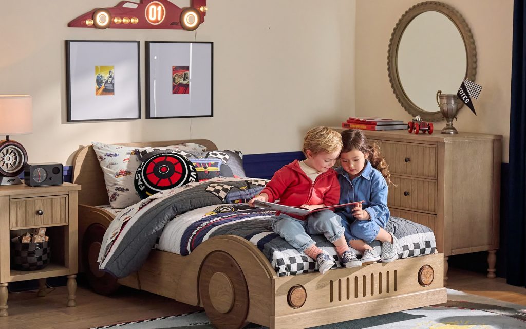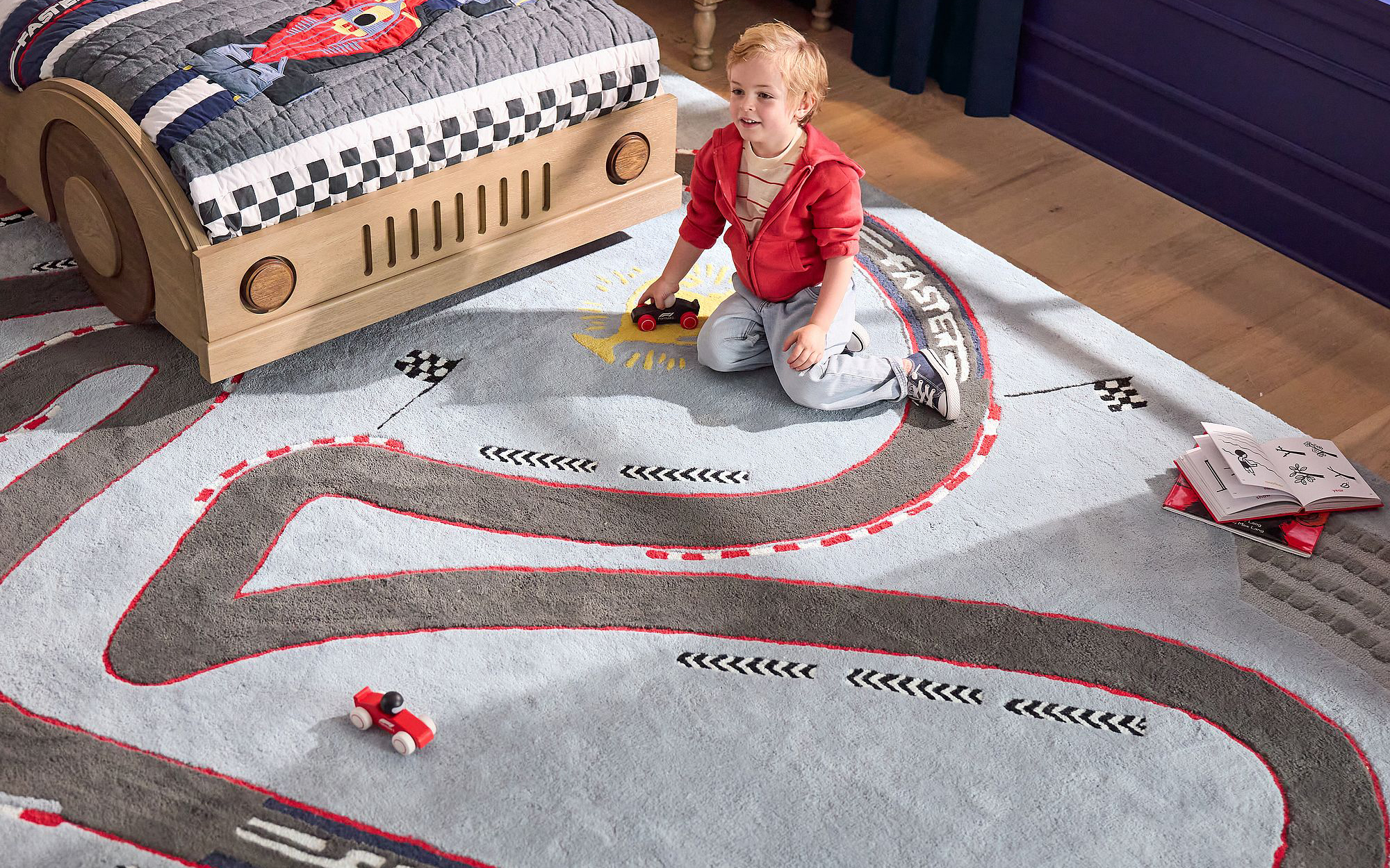 The collection, which is available now, includes bedding, rugs, décor, and accessories for children and teens. The designs channel the spirit of race day through a bold palette of racing red, jet black, white, and metallic accents, while checkered patterns and car motifs bring the look and feel of the track into everyday spaces. Pottery Barn Teen’s offering even extends to modern lighting shaped by wheel motifs and rugs styled as artful homages to circuits.