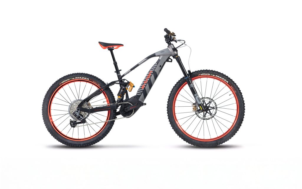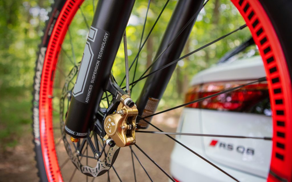 Suspension upgrades carry over the pedigree Audi enthusiasts expect. A coil-sprung Öhlins TTX22m.2 rear shock and an air-sprung Öhlins RXF38 m.2 fork provide 180mm of fully adjustable travel, giving this bike the chops for everything from singletrack touring to aggressive downhill riding.