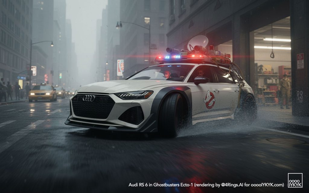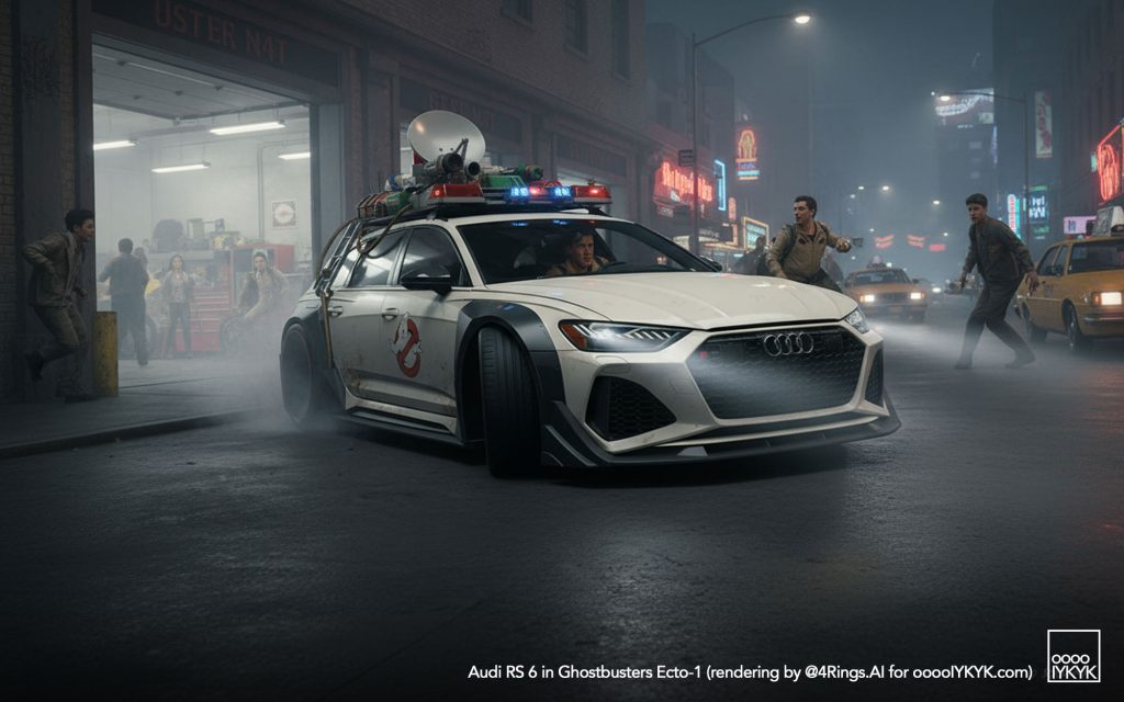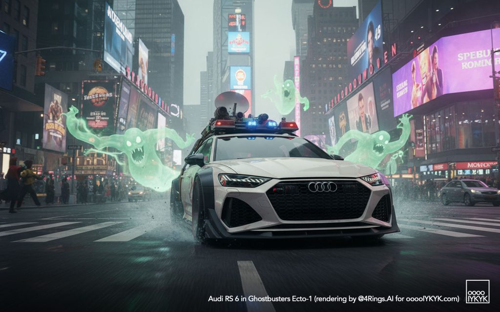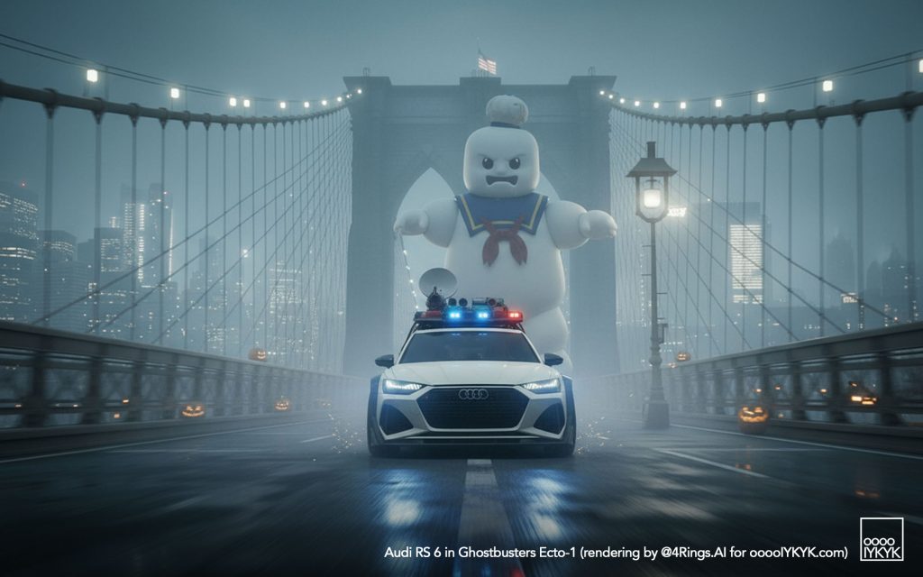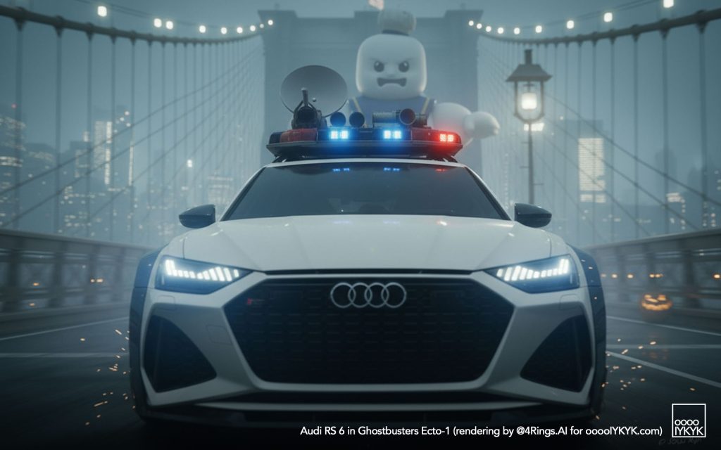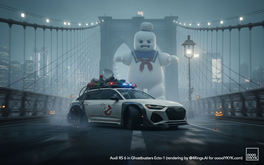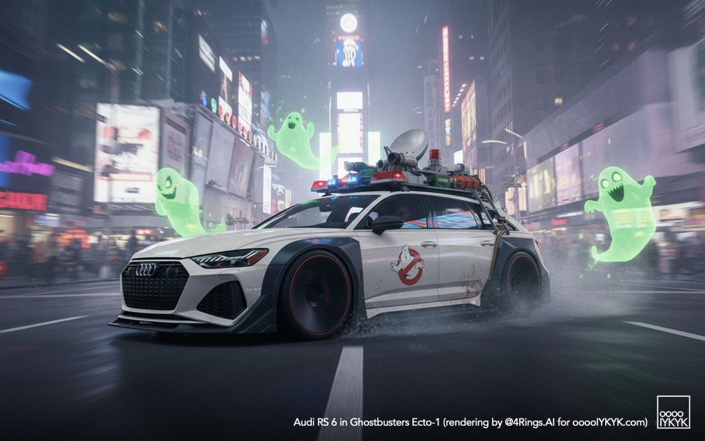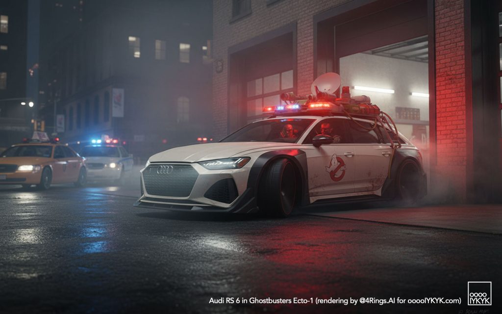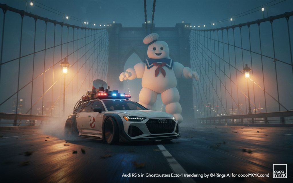 This time, I’ve gone a bit further by using multiple layers of creations to evolve – first concept widebody RS 6 in drawing form, then adding Ghostbusters specification to the car. From there, I generated more realistic images and placing the car in Ghostbusters-like settings like firehouse headquarters, racing through Manhattan’s Times Square being chased by Ghosts, or across the Brooklyn Bridge being chased by a marshmallow man.