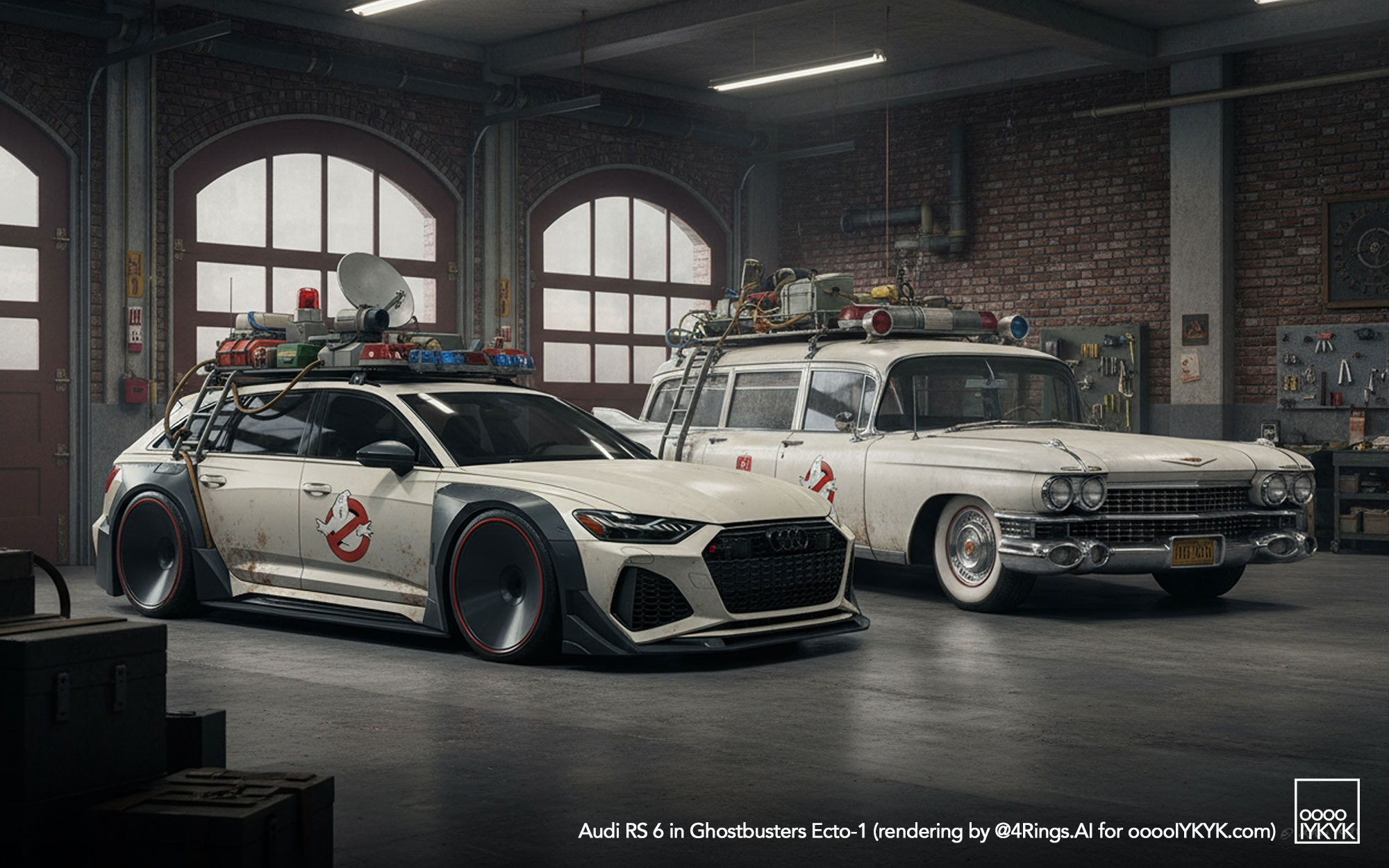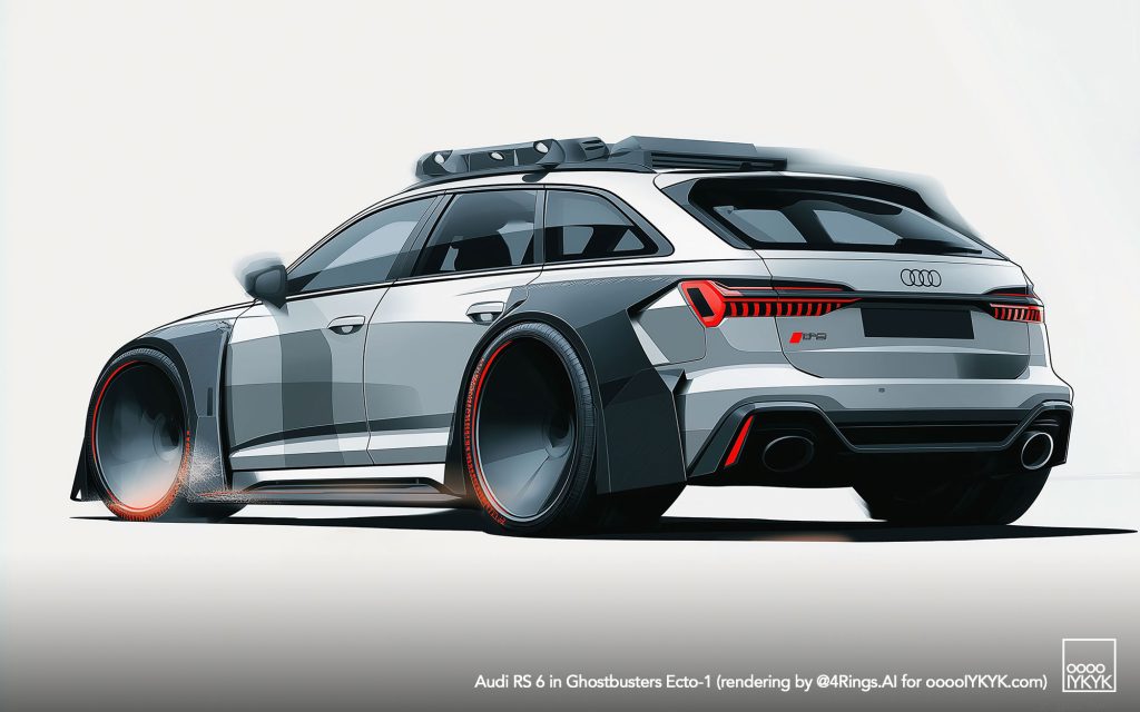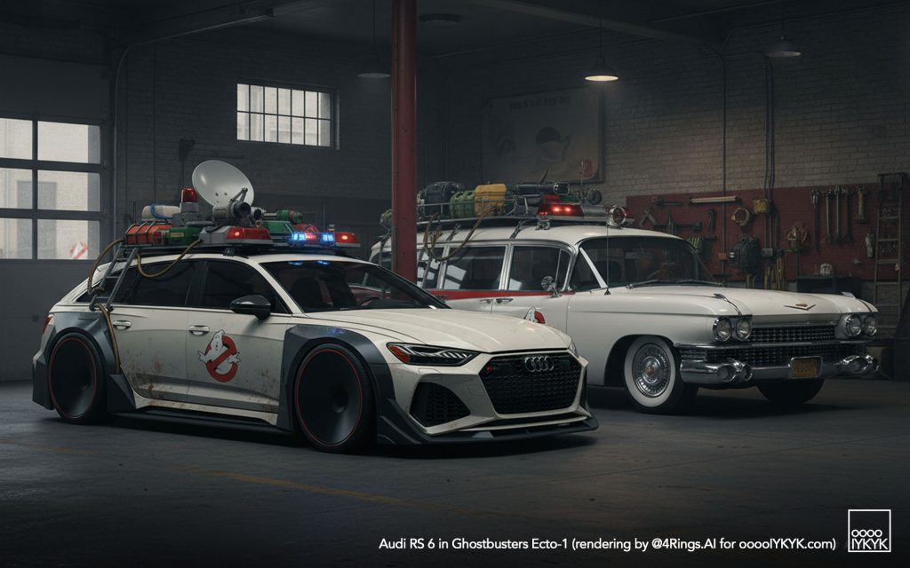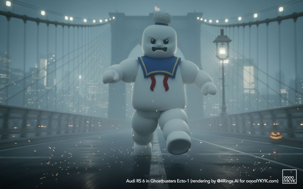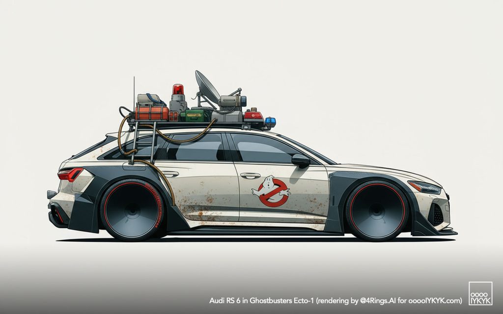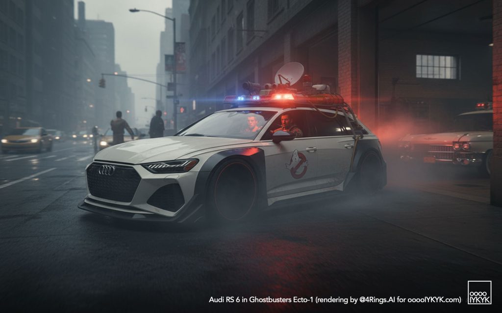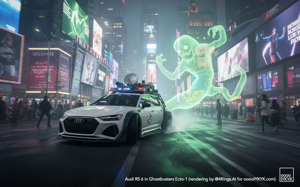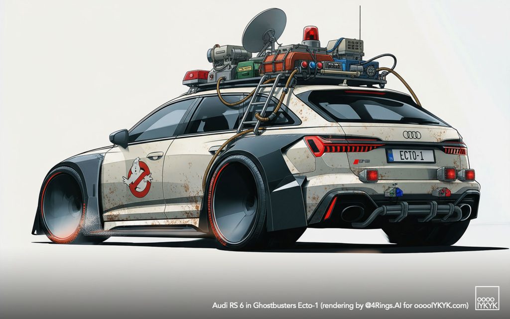 This time, I’ve gone a bit further by using multiple layers of creations to evolve – first concept widebody RS 6 in drawing form, then adding Ghostbusters specification to the car. From there, I generated more realistic images and placing the car in Ghostbusters-like settings like firehouse headquarters, racing through Manhattan’s Times Square being chased by Ghosts, or across the Brooklyn Bridge being chased by a marshmallow man.