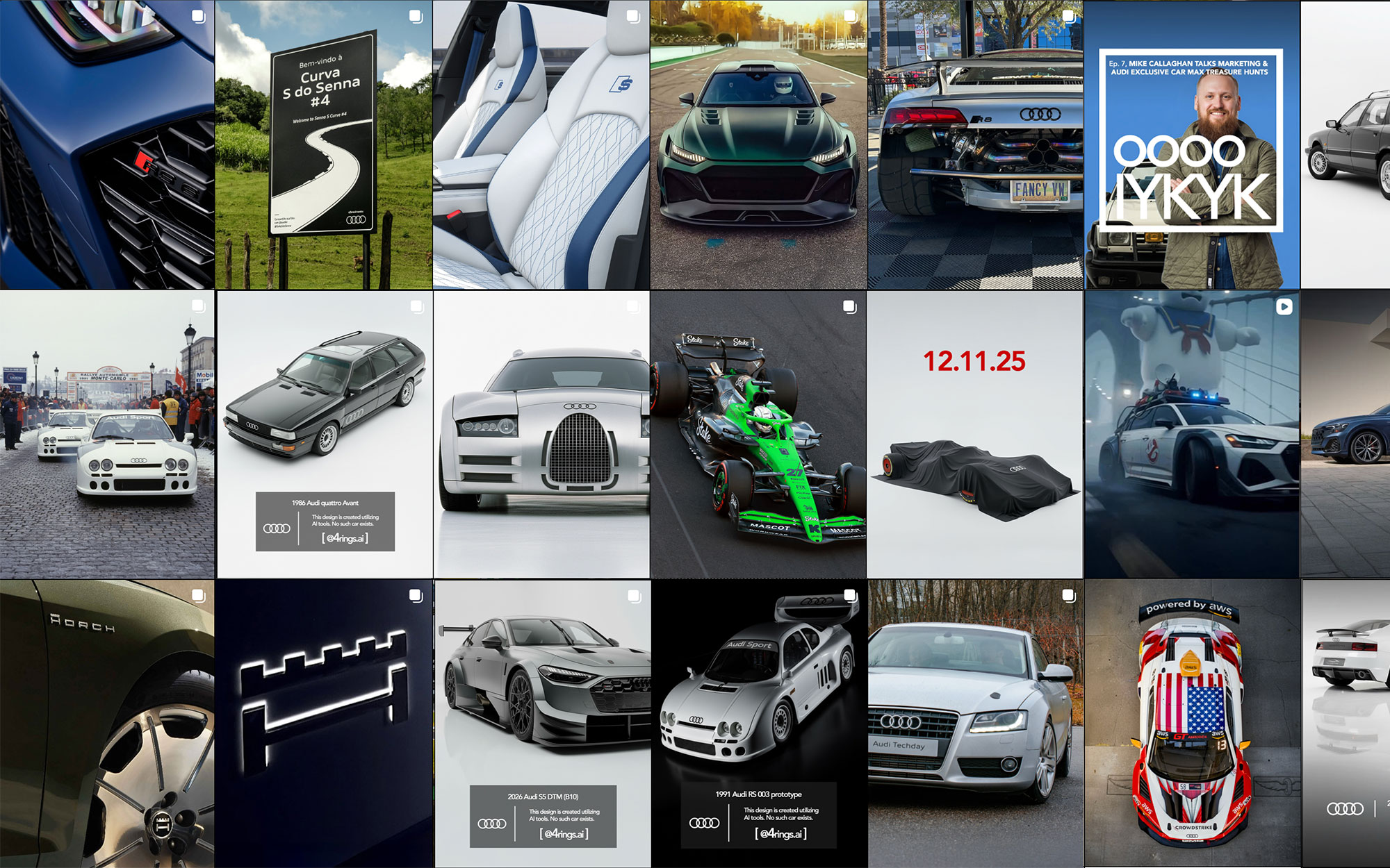 If you’ve noticed, This week, I’m focusing on Instagram — specifically @ooooIYKYK often works in tandem with another Audi-focused account — @4Rings.AI. That project centers on AI-generated renderings of Audi models, typically exploring imagined designs. It also supports this site by creating visuals for upcoming models, providing original imagery of older cars where photos are scarce, and promoting the recurring “AI Imagined” story series that forms part of this site’s original mix.