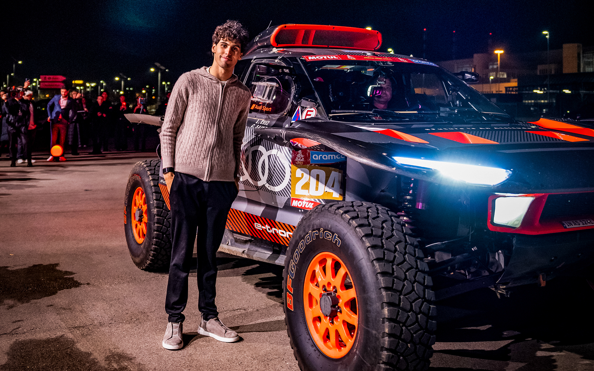 A few steps away, young F1 driver Gabriel Bortoleto paired with the Audi RS Q e-tron, the hybrid-electric racer that intelligently reused Formula E power units and the RS 5 DTM’s turbocharged engine as range extender in order to win the Dakar Rally.