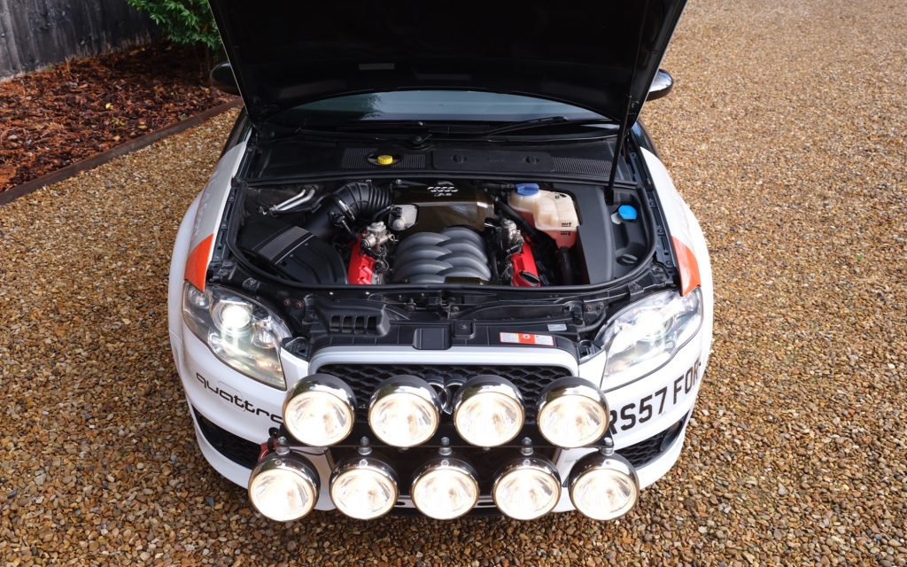 This particular car was chosen and used by Jeremy Clarkson for some Arctic circle misadventures of “A Scandi Flick,” where he embraced full Audi rally cosplay. On location in Sweden, the production team outfitted the car with rally-era stripes, B5 touring car era descending rings, nine auxiliary spotlights and just enough attitude to hold its own against Richard Hammond’s chosen Mitsubishi Evo and James May’s chosen Subaru WRX STI. According to Clarkson, the 4.2 V8 is “one of the three best engines ever made”.