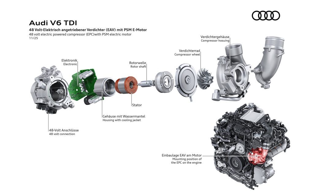 Audi’s second-generation electrically powered compressor (EPC) is now far more central to the engine’s operation, capable of running across the entire rpm range rather than only at low engine speeds.