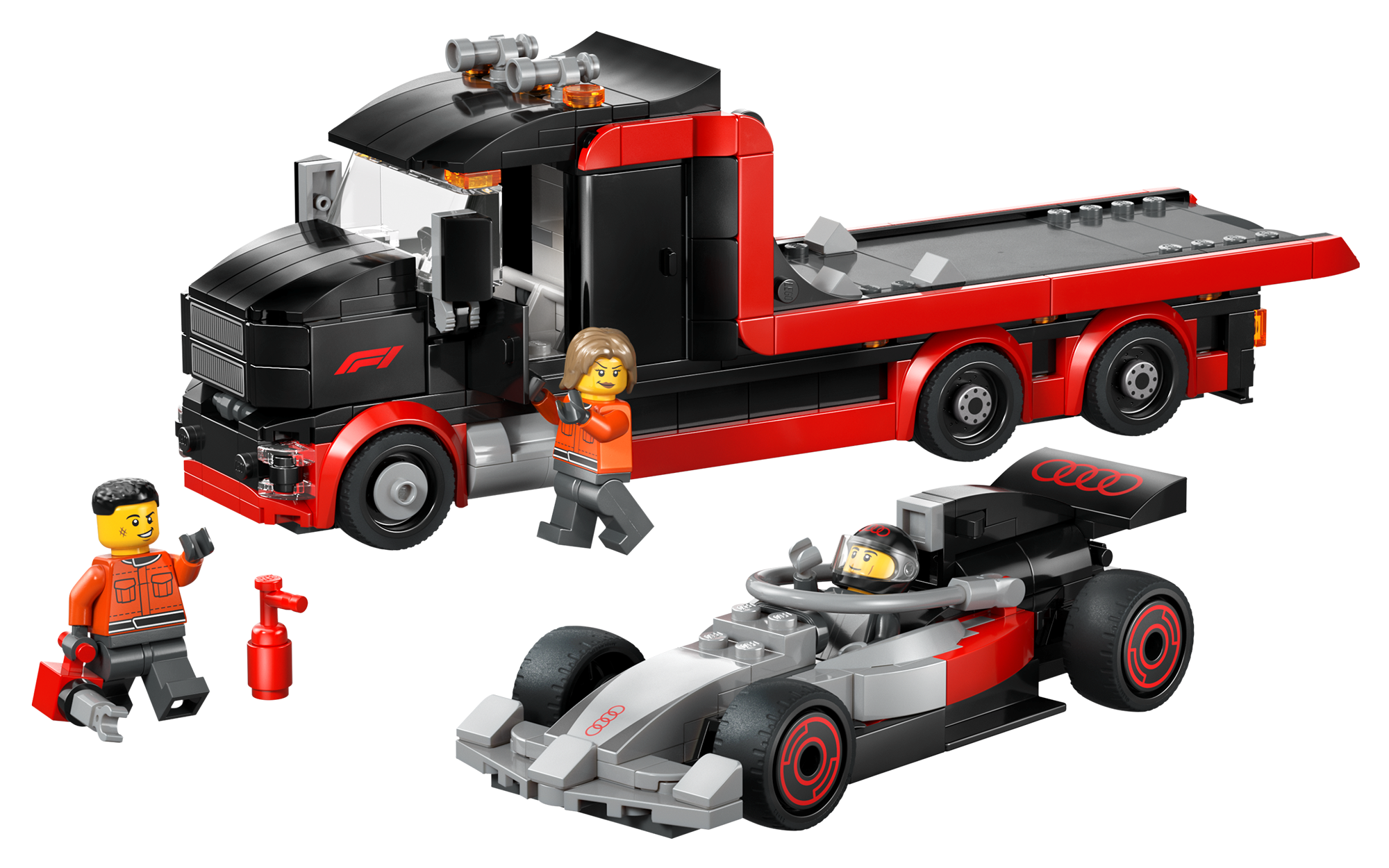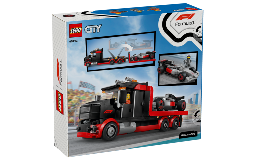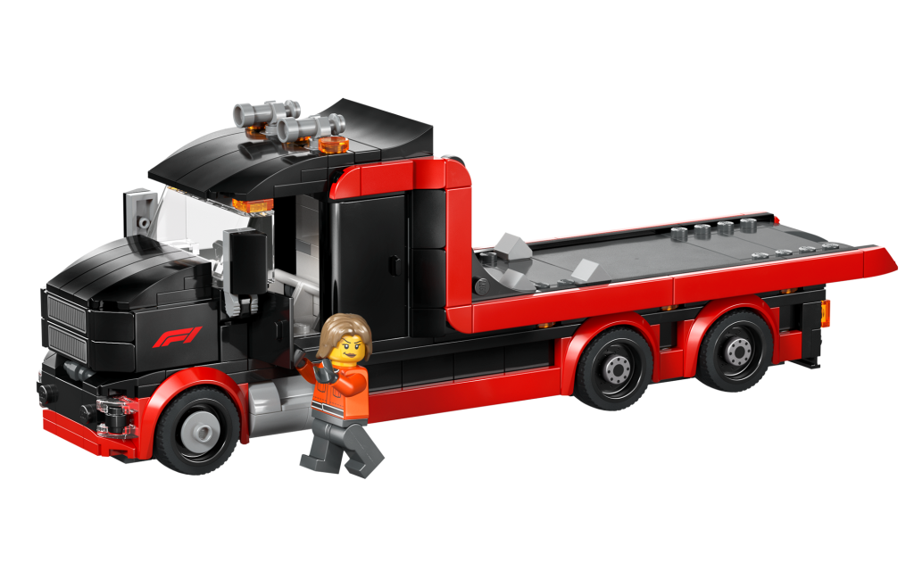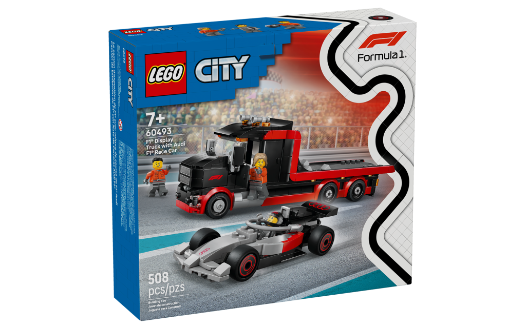 The kit we can now confirm, #60493, F1® Display Truck with Audi F1® Race Car, is part of the LEGO City line of kits. Not quite as detailed as the Speed Champions kits offered for every team on the grid last year and expected for Audi this year, LEGO City tends to be more playable and children-oriented. It’s made up of 508 pieces that make the Audi R26, a flat-bed race carrier and three mini-figs including Audi F1 driver with logo on helmet.