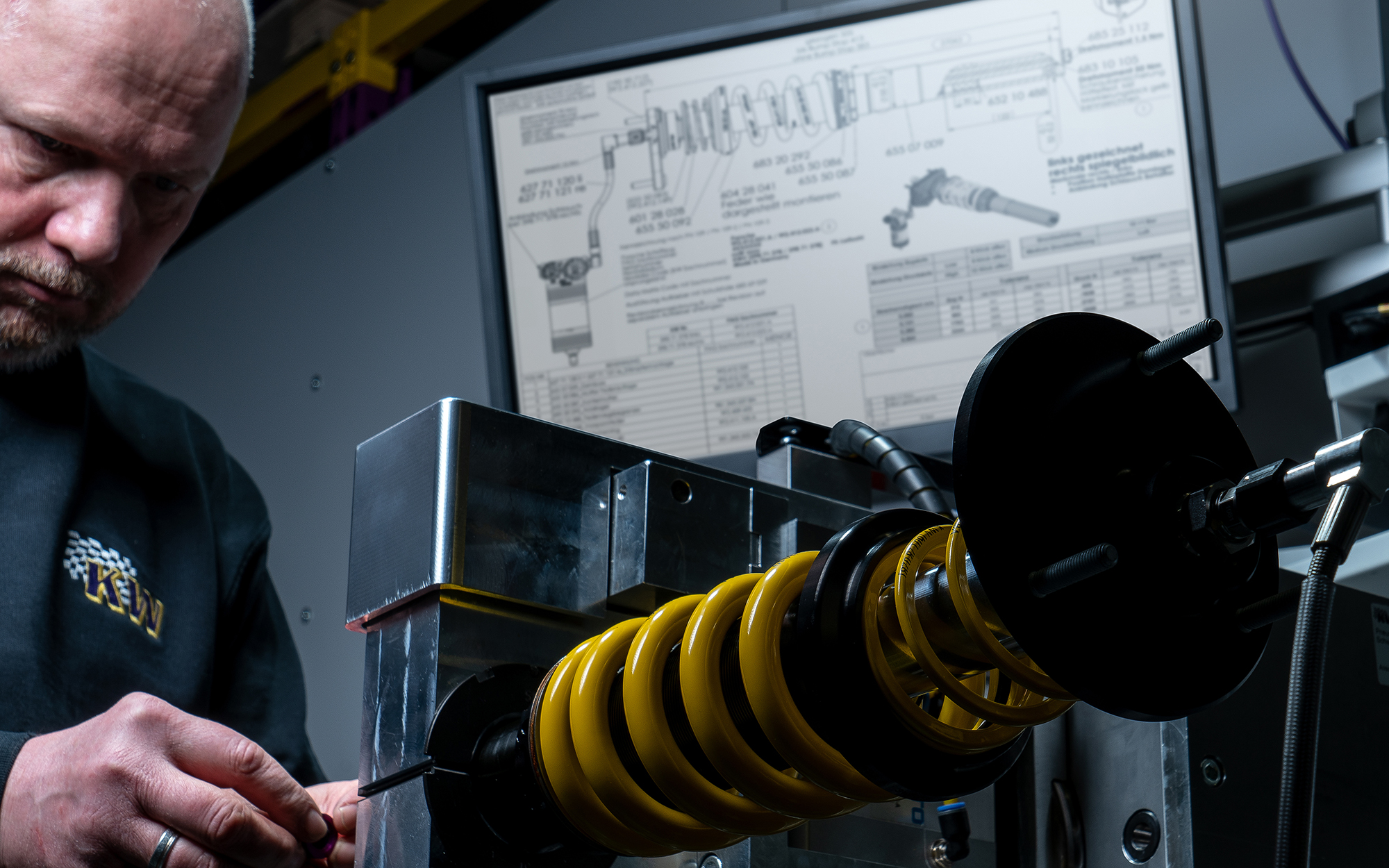 Every KW suspension is manufactured to order at the company’s Fichtenberg headquarters. With a vertical integration rate approaching 95 percent, nearly all components—from damper housings to final assembly—are produced in-house. Depending on specification, a single suspension can require more than 85 production steps.