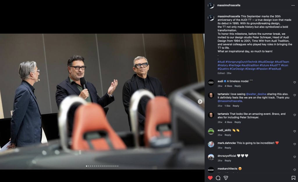 Following his time at Ford, Frascella next lands at Kia’s California design studio for six years, leaving for JLR in 2011. If so, that has him both leaving shortly after Mays’ and Thomas’ Ford departures and arriving at Hyundai. Another TT (Mk1)-connected designer Peter Schreyer was Chief Design Officer at Kia from 2006-2013. No doubt they worked together, so it’s probably no surprise that a now-retired Peter Schreyer showed up as an honored guest at a TT-celebrating event at Audi’s Ingolstadt design center prior to the Concept C reveal – something we spotted on his Instagram months ago.