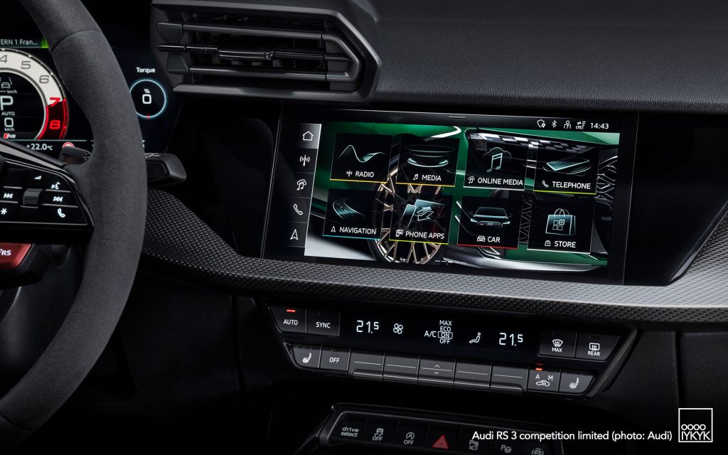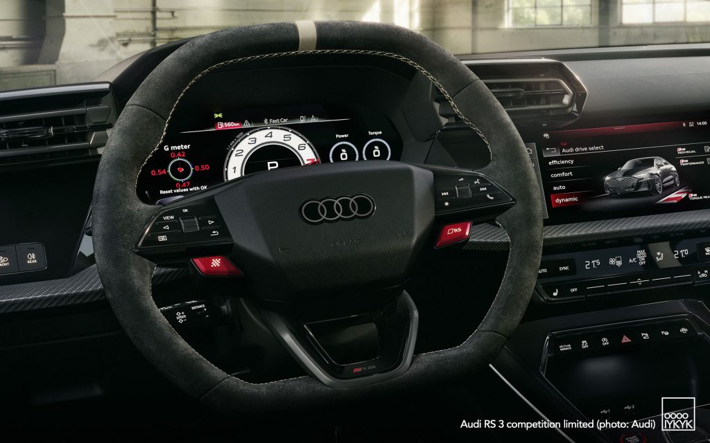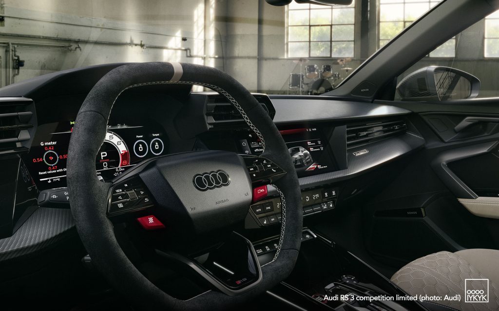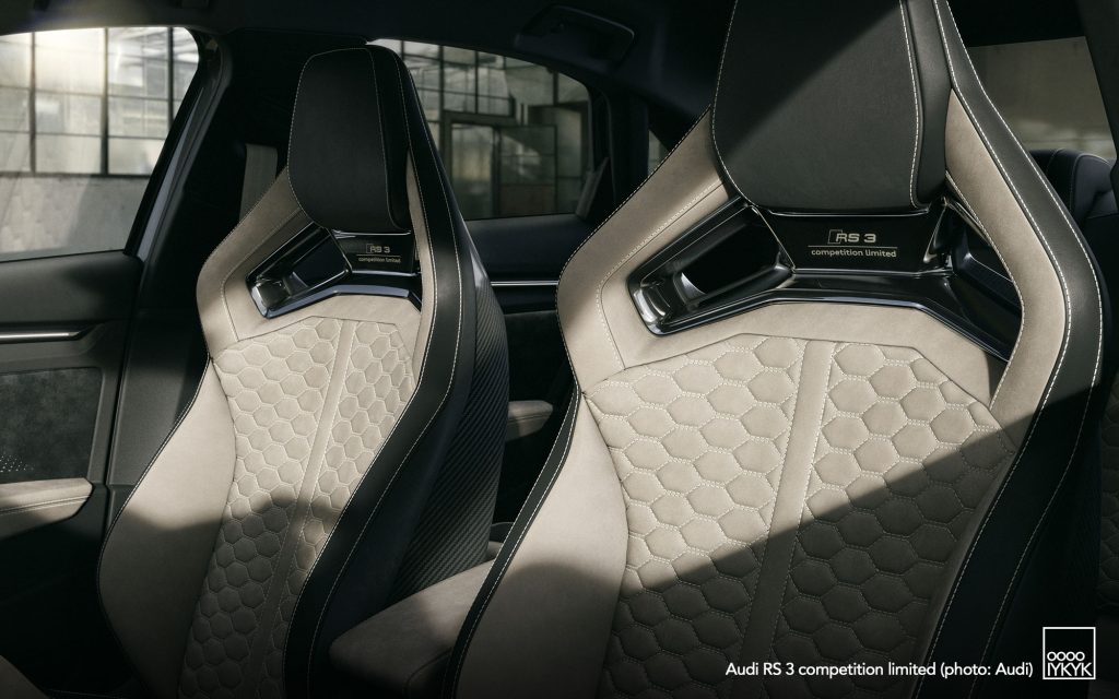 At the heart of the RS 3 competition limited is Audi’s 2.5-liter TFSI inline-five, producing 400 horsepower and 500 Nm of torque. The engine accelerates the compact performance car from 0–100 km/h in 3.8 seconds, with top speed raised to 290 km/h.