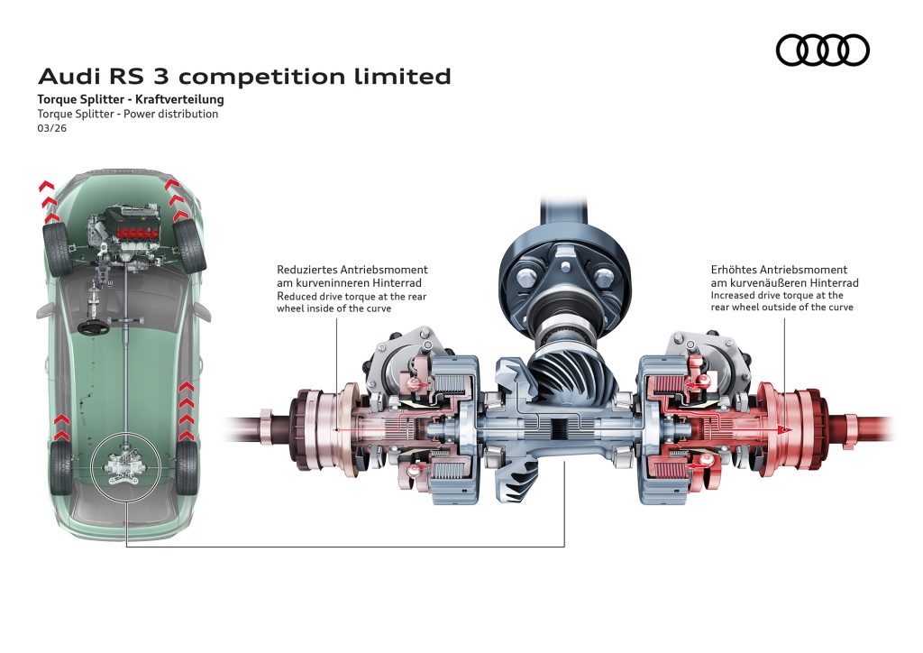 At the rear axle, a new tubular stabilizer with increased wall thickness improves stiffness compared with the standard RS 3 setup. Combined with revised rear spring rates, the system is designed to deliver greater directional stability and sharper handling when accelerating out of corners.