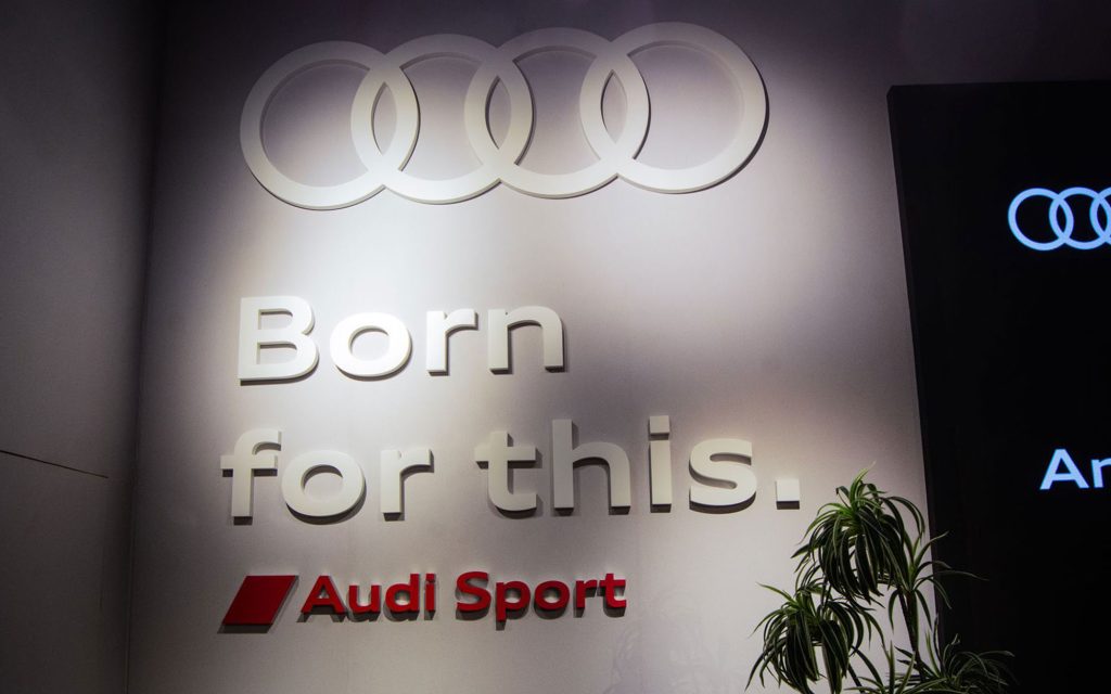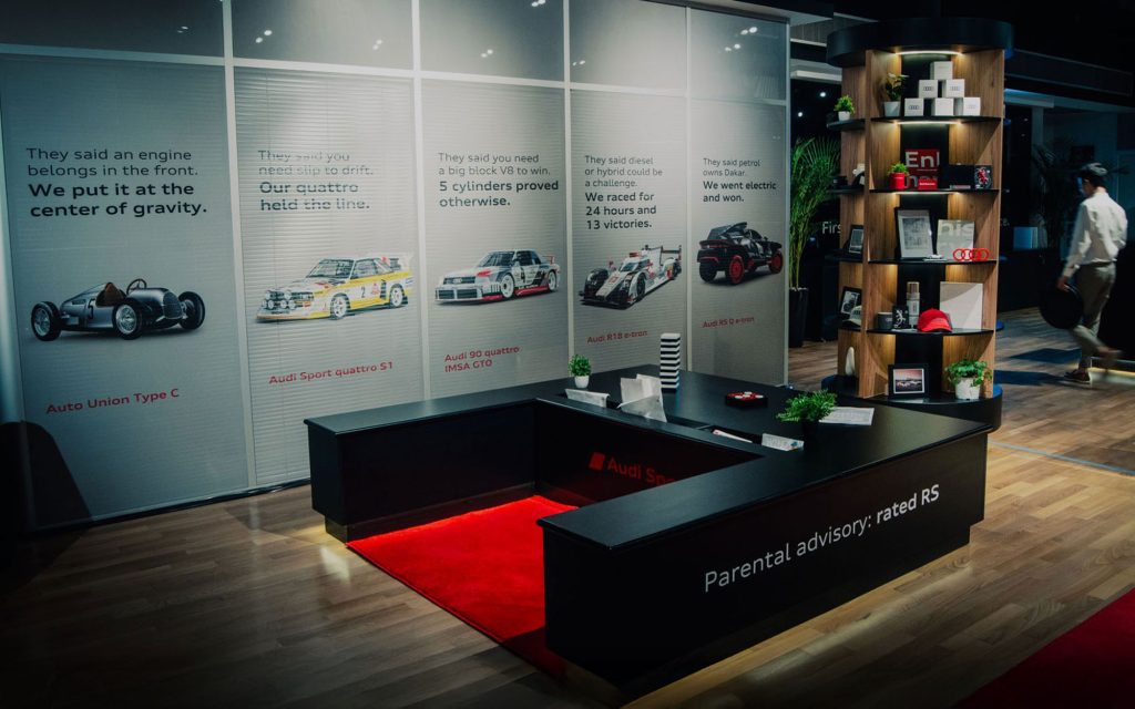 The environment is unmistakably Audi Sport, with the brand’s signature motorsport-inspired identity shaping the atmosphere throughout the space.