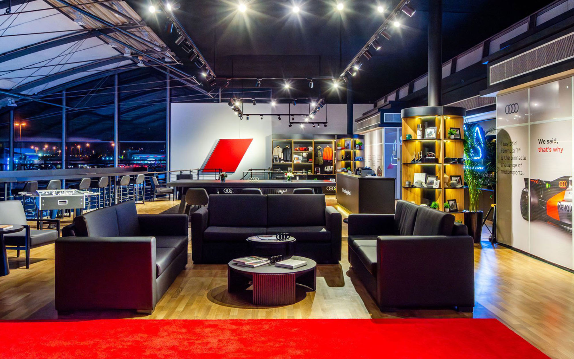 Audi’s performance models anchor the showroom floor below, while the lounge itself sits above as a more intimate setting intended for conversation, anticipation and shared race-day moments.