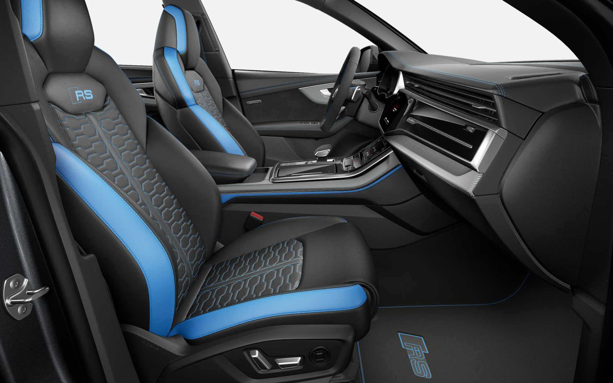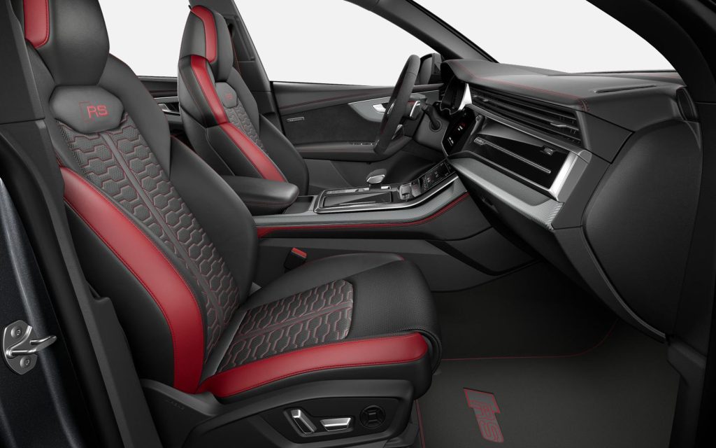 The next package is similar across the board. A mainly black RS Q8 interior gets matching deviated stitching, seatbelts, colored leather panels on the outer bolsters, trim around the edges of the floor mats and embroidered “RS” logos on seats and floor mats.