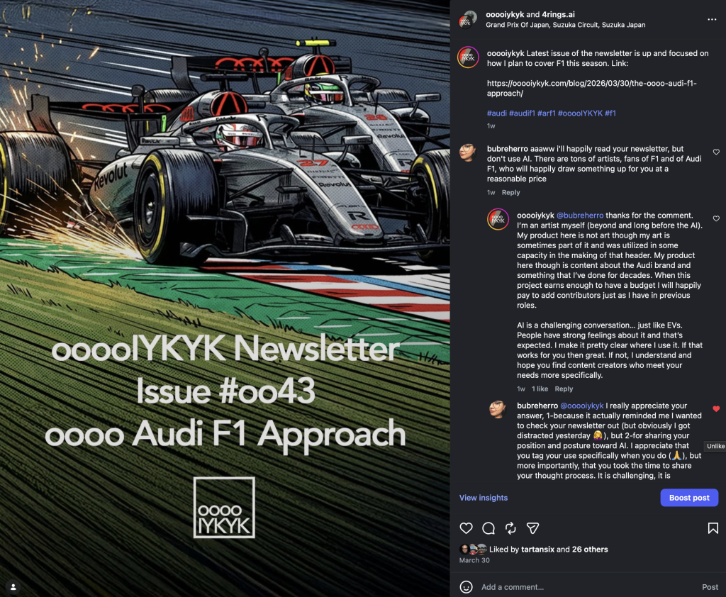 “aaaww i’ll happily read your newsletter, but don’t use AI. There are tons of artists, fans of F1 and of Audi F1, who will happily draw something up for you at a reasonable price.”