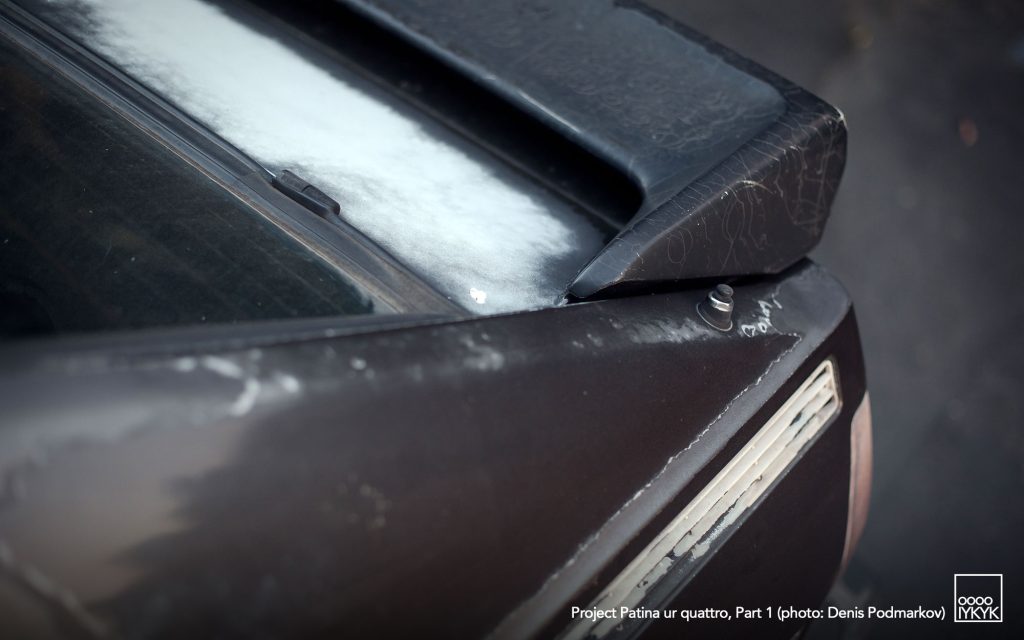 This one’s been modified, driven hard… but not put away wet fortunately. In as much, clear coat is peeling and Audi logo decals on the doors are baked and cracked, albeit not as baked and cracked as the finish on the rear spoiler.
