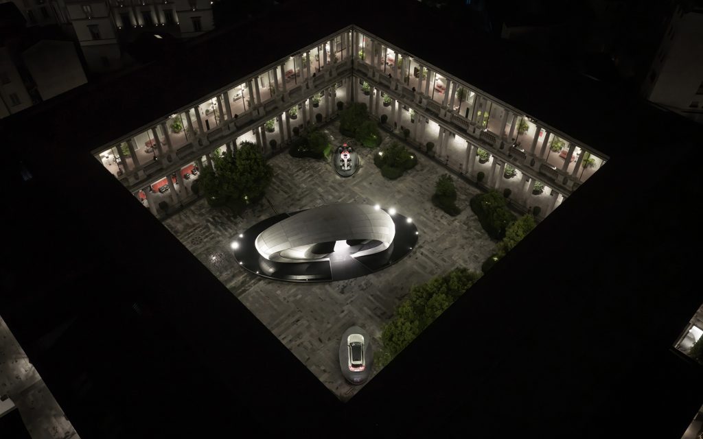 Night-time aerial view of the installation “Origin” during Milan Design Week 2026. The reduced, oval architectural form contrasts with the historic courtyard architecture, underscoring the approach to design as a cultural dialogue.