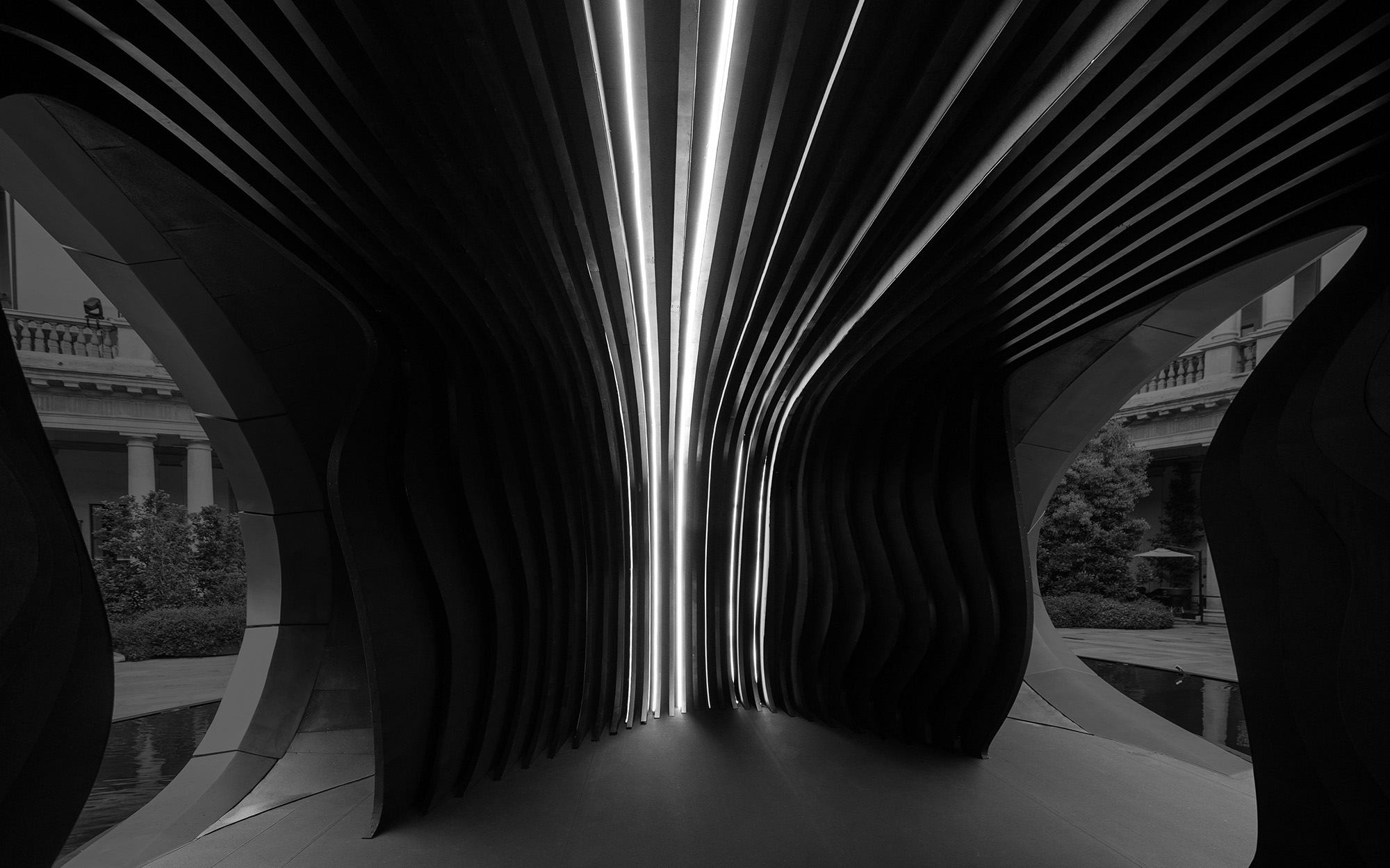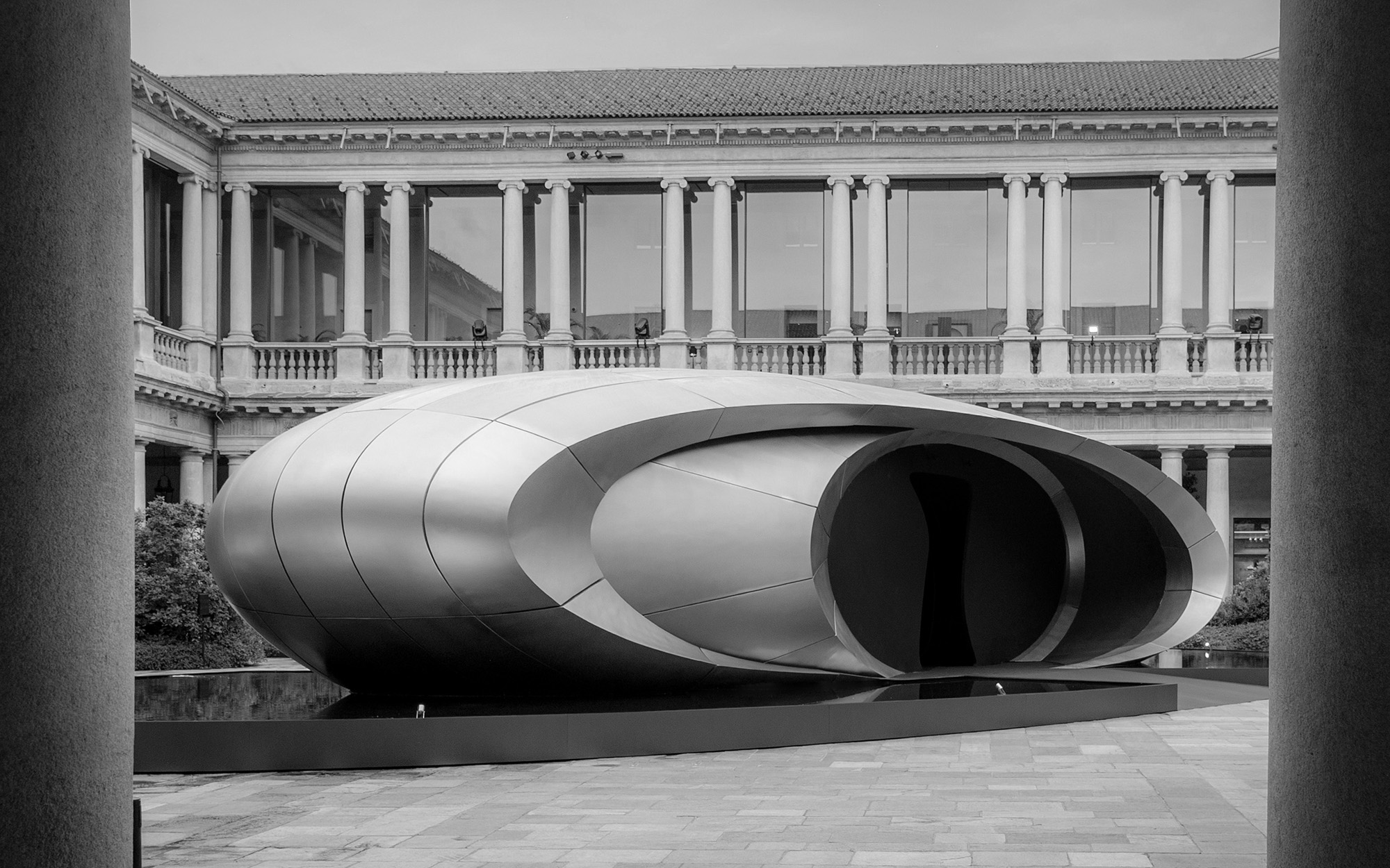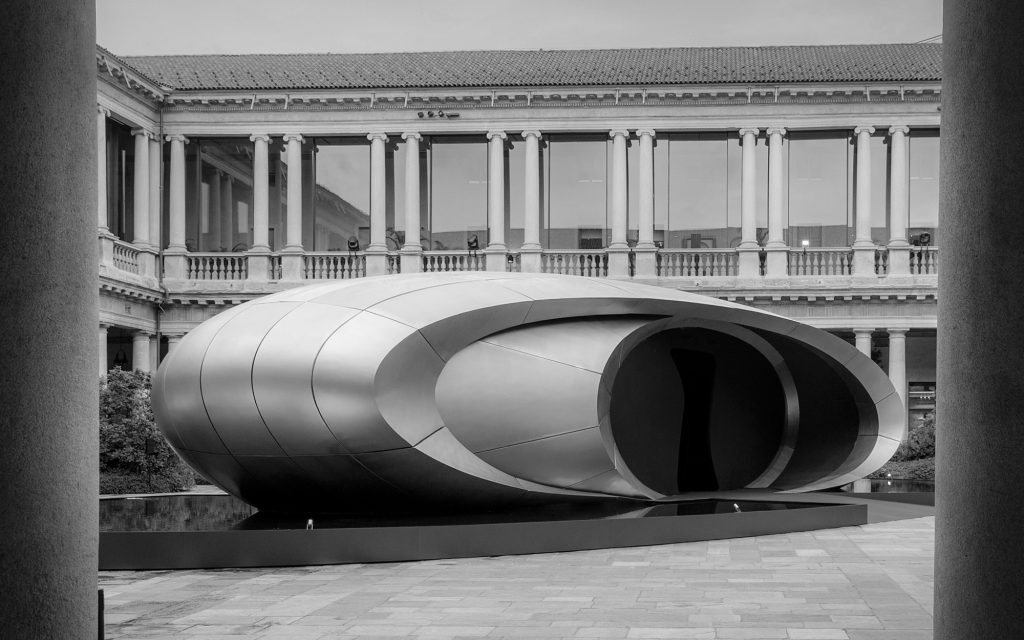 Audi’s installation “Origin” in the courtyard of the former Archiepiscopal Seminary in Milan. Developed in collaboration with Zaha Hadid Architects, the sculptural structure translates Audi’s design philosophy – clarity, technical precision and emotion – into an architectural spatial installation that forms a deliberate counterpoint to the visual density of the city.