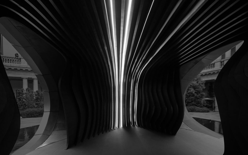 Interior view of the installation “Origin”. The interplay of light, material and spatial composition creates an immersive environment that invites visitors to focus their perception and experience a moment of calm within Milan’s urban setting.