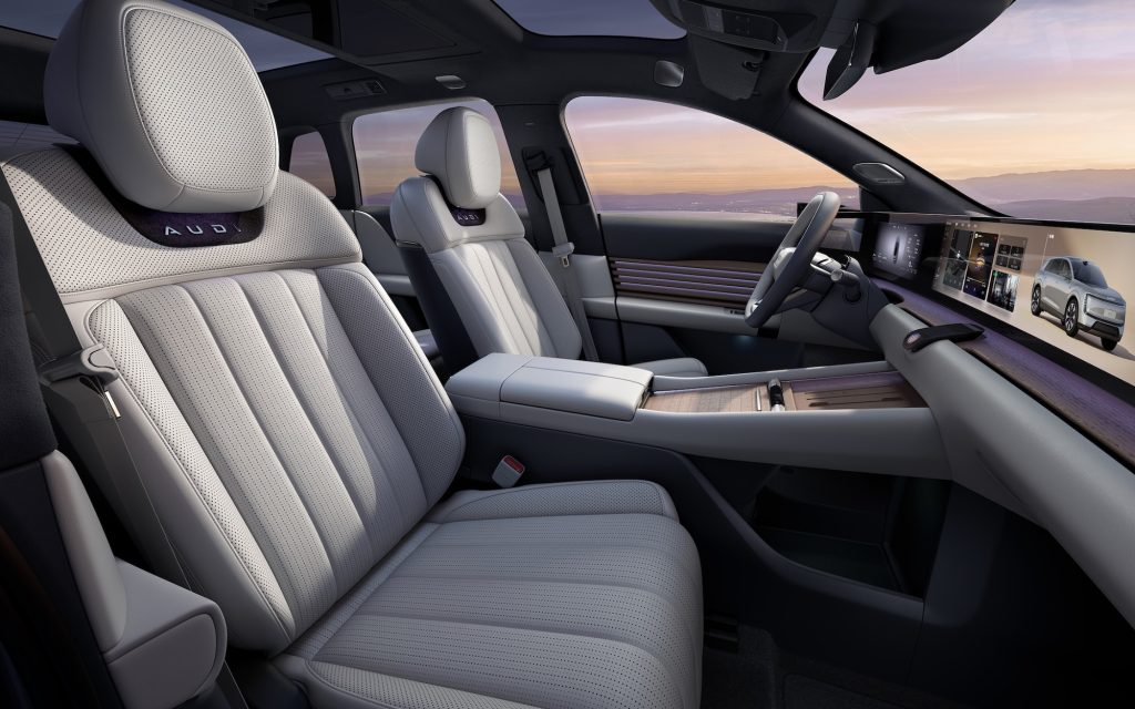 The exterior adopts a revised interpretation of Audi design language for the AUDI sub-brand. A prominent feature is the “Light Frame,” integrating more than 1,000 individual lighting elements into the front and rear signatures. Functional components such as sensors and lighting units are grouped within a continuous black surround.